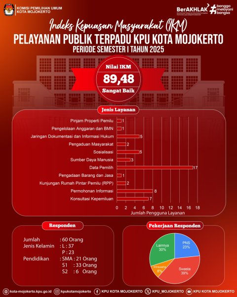 KPU Kota Mojokerto telah melaksanakan survei Indeks Kepuasan Masyarakat (IKM) terhadap pelayanan publik terpadu pada Semester I Tahun 2025. Hasil survei menunjukkan nilai IKM sebesar 89,48 dengan kategori Sangat Baik.