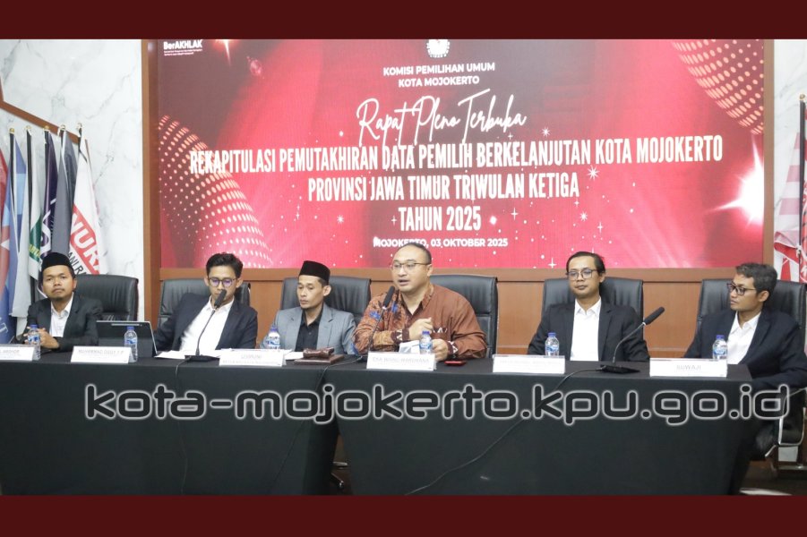 Mojokerto, kota-mojokerto.kpu.go.id — Komisi Pemilihan Umum (KPU) Kota Mojokerto menggelar Rapat Pleno Terbuka Rekapitulasi Pemutakhiran Data Pemilih Berkelanjutan (PDPB) Triwulan Ketiga Tahun 2025, pada Jumat (3/10/2025) pukul 13.00 WIB di Kantor KPU Kota Mojokerto.