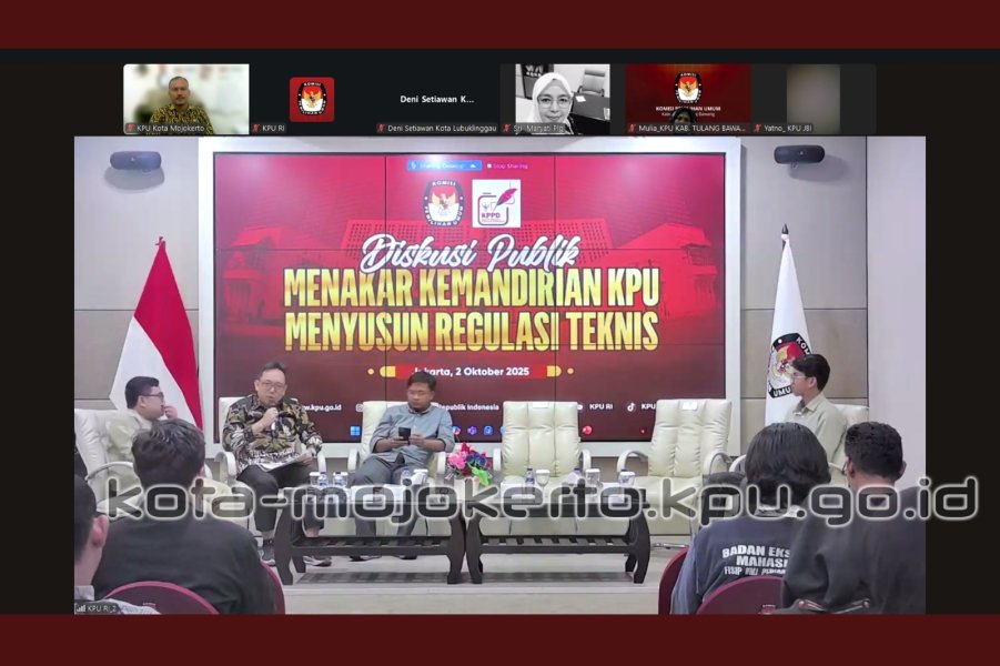 Mojokerto, kota-mojokero.kpu.go.id – KPU Kota Mojokerto turut serta dalam acara diskusi publik yang diselenggarakan oleh Koalisi Pewarta Pemilu dan Demokrasi (KPPD) bersama dengan KPU RI. Acara yang dilaksakan secara hybrid di Media Center KPU RI, Kamis (2/10) ini mengambil tema "Menakar Kemandirian KPU Menyusun Regulasi Teknis". KPU Kota Mojokerto diwakili oleh Divisi Hukum dan Pengawasan, Suwaji, Divisi Teknis Penyelenggaraan Pemilu, Ulil Abshor dan Kepala Sub Bagian Teknis Penyelenggaraan Pemilu dan Hukum, M. Samsul Arif.