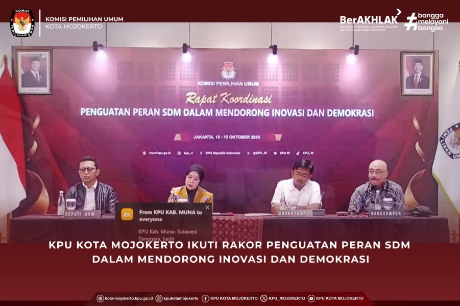 Mojokerto, kota-mojokerto.kpu.go.id — Komisi Pemilihan Umum (KPU) Kota Mojokerto mengikuti Rapat Koordinasi Penguatan Peran SDM dalam Mendorong Inovasi dan Demokrasi yang digelar oleh KPU RI secara daring melalui aplikasi zoom meeting selama 2 hari, Senin s.d Selasa, 13-14 Oktober 2025.