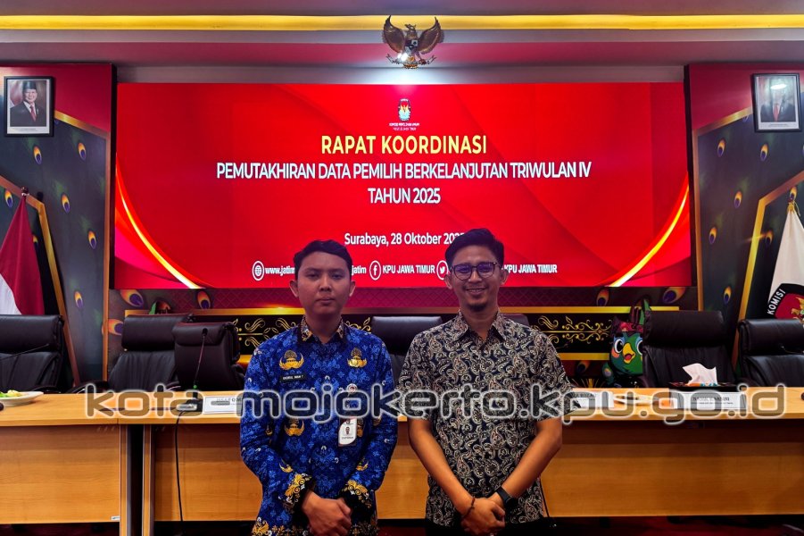 Mojokerto, kota-mojokerto.kpu.go.id – Komisi Pemilihan Umum (KPU) Kota Mojokerto menghadiri Rapat Koordinasi Pemutakhiran Data Pemilih Berkelanjutan (PDPB) bersama KPU Kabupaten/Kota se-Jawa Timur yang digelar oleh KPU Provinsi Jawa Timur, pada Selasa (28/10/2025). Kegiatan ini merupakan tindak lanjut dari pelaksanaan PDPB Triwulan III Tahun 2025, sekaligus membahas langkah persiapan menuju pelaksanaan PDPB Triwulan IV Tahun 2025.