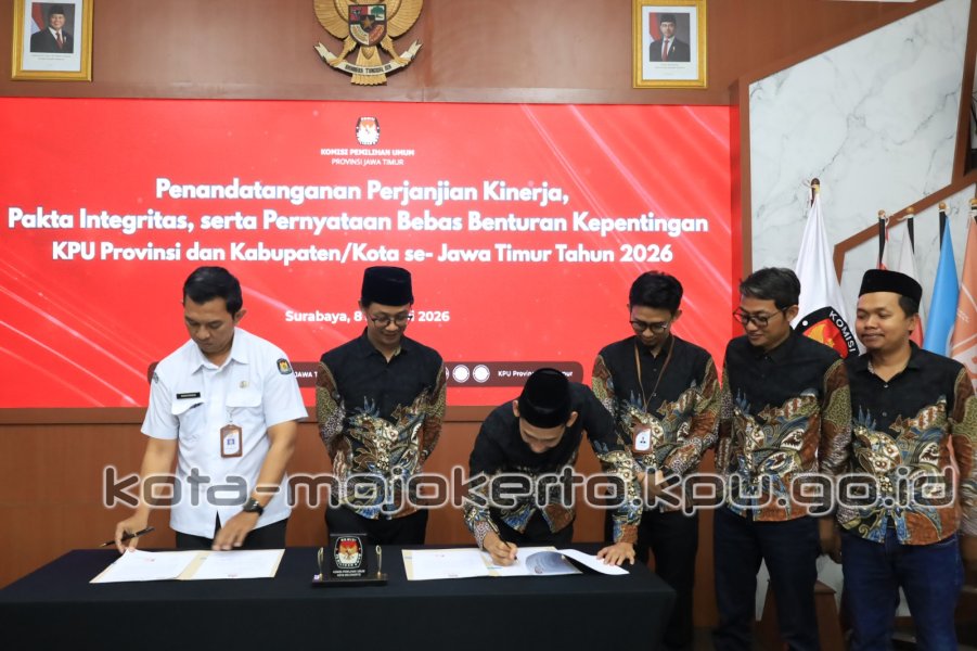 KPU Kota Mojokerto Ikuti Penandatanganan Perjanjian Kinerja, Pakta Integritas, dan Pernyataan Bebas Benturan Kepentingan Serentak se-Jawa Timur Tahun 2026
