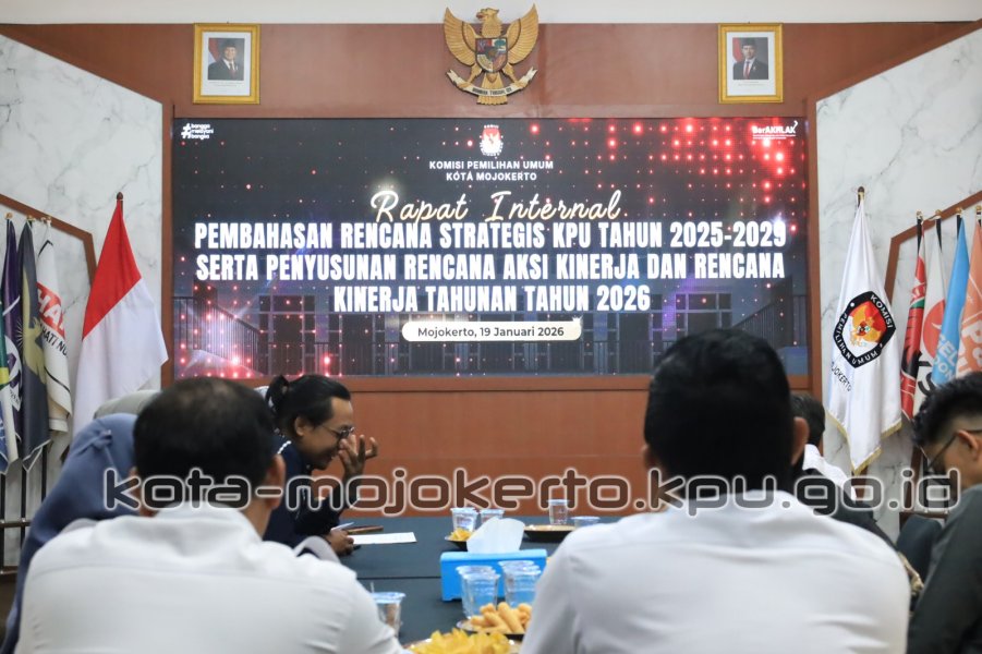 Kota Mojokerto, kota-mojokerto.kpu.go.id – Komisi Pemilihan Umum (KPU) Kota Mojokerto menggelar Rapat Internal Pembahasan Rencana Strategis (Renstra) KPU Tahun 2025–2029 serta Penyusunan Rencana Aksi Kinerja dan Rencana Kinerja Tahunan (RKT) Tahun 2026 pada Senin, 19 Januari 2026, bertempat di Ruang Rapat KPU Kota Mojokerto. Kegiatan ini dilaksanakan sebagai bagian dari upaya penguatan perencanaan strategis dan peningkatan kinerja kelembagaan KPU Kota Mojokerto.
