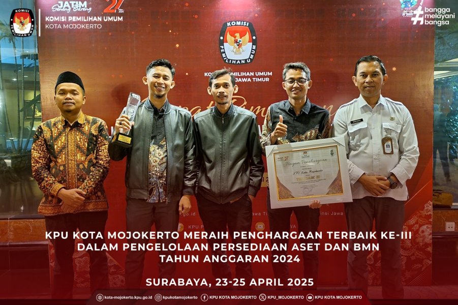 Surabaya, kota-mojokerto.kpu.go.id — KPU Kota Mojokerto meraih Penghargaan dari KPU Provinsi Jatim sebagai Terbaik ke-III dalam Pengelolaan Persediaan Aset dan BMN Tahun Anggaran 2024. Penghargaan tersebut diterima oleh KPU Kota Mojokerto dalam acara Rapat Pimpinan (Rapim) Evaluasi Penyelenggaraan Pilkada Serentak Tahun 2024 di Jawa Timur, Kamis, 24 April 2025. Rapim dilangsungkan di Hotel JW Marriott, Jalan Embong Malang Nomor 85-89 Kedungdoro, Tegalsari, Surabaya, pada 23-25 April 2025.