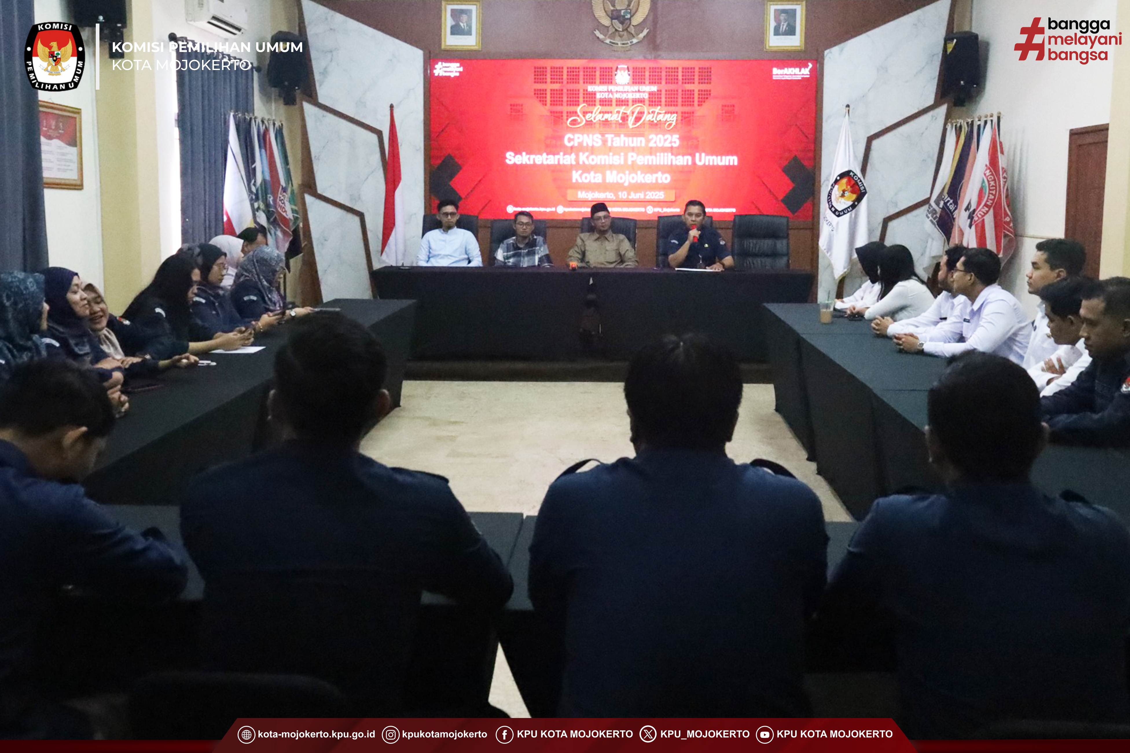 Acara Penyambutan CPNS Tahun 2025 tersebut bertempat di aula kantor KPU Kota Mojokerto, dengan dihadiri oleh Komisioner KPU Kota Mojokerto, yakni Divisi Sosdiklih, Parmas dan SDM, Yahya Sachrul Wahyu I.A, Divisi Perencanaan, Data dan Informasi, M. Oggy Yulian Pratama, dan Divisi Hukum dan Pengawasan, Suwaji, beserta Sekretaris dan jajaran Kasubbag dan staf Sekretariat KPU Kota Mojokerto.