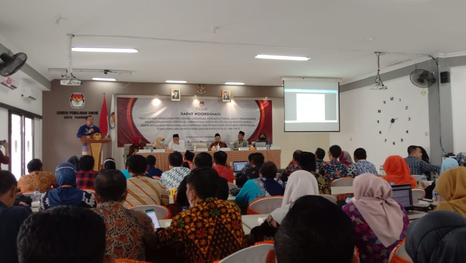 Rakor yang dilaksanakan di Aula Lantai II Kantor KPU Kota Pasuruan tersebut, membahas mengenai Penyusunan Peraturan Perundang-undangan, Persiapan Tindak Lanjut Penanganan Pelanggaran pada Verifikasi Administrasi Partai Politik Calon Peserta Pemilu serta Sosialisasi Pengendalian Gratifikasi dan Penanganan Benturan Kepentingan KPU Provinsi dan KPU Kabupaten/Kota se-Jawa Timur.