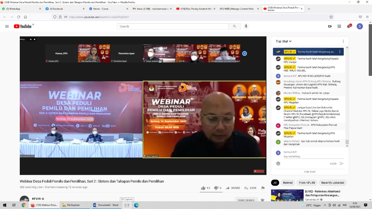 Kota Mojokerto - Selasa (14/09/2021) KPU Kota Mojokerto kembali mengikuti acara Webinar Desa Peduli Pemilu dan Pemilihan melalui kanal youtube KPU RI. Seri ke-2 kali ini mengambil tema “Sistem dan Tahapan Pemilu dan Pemilihan” dengan menghadirkan narasumber  antara lain, Pramono Ubaid Tanthowi (Anggota KPU RI), Dahlia Umar (Netfid) serta Mada Sukmajati (Universitas Gadjah Mada). Acara yang dimoderatori oleh Priskilla Dauhan dimuali pukul 09.00 WIB dan dibuka oleh Ilham Saputra, Ketua KPU RI dan I Dewa Kade Wiarsa raka Sandi, Anggota KPU RI. Dalam sambutan dan arahannya, Ilham menyampaikan jika membicarakan tentang sistem Pemilu seolah tidak tidak ada ujungnya, karena setiap negara selalu malakukan pencarian terhadap sebuah sistem yang ideal. “Sistem kepemiluan harus terus dikaji untuk dicari kelemahan dan kelebihannya, dan kita (di Indonesia) saat ini menggunakan sistem proporsional terbuka sejak Pemilu 2014”, ujar Ilham. Lebih lanjut Ilham mengatakan jika tahapan dibentuk untuk mendesain, merencanakan, serta memudahkan pelaksanaan Pemilu. “Menurut IDEA, tahapan Pemilu terbagai menjadi tiga fase besar, pra Pemilu, masa Pemilu dan paska Pemilu”, jelas Ilham dalam sambutannya. Pada pemapaparan materi pertama, Mada Sukmajati, menyebut bahawa pada dasarnya demokrasi di Indonesia berakar dihulu yaitu desa. “Acara yang digagas oleh KPU saya kira cukup baik, karena sama saja mengajak terutama didesa tidak hanya sebagai hanya obyek demokrasi dan pemilu, melainkan mentransformasi mereka menjadi subyek”, ujar Sukmajati. Dalam paparannya, Sukmajati juga menyebut jika secara definisi, Pemilu dapat dijelaskan secara teoritik dan regulatif. Sedangkan mengenai sistem Pemilu, menurut IDEA, sistem Pemilu terbagi menjadi empat rumpun besar antara lain, pluralitas/mayoritas; campuran; proporsional; dan lainnya. Materi kedua disampaikan oleh Pramono Ubaid Tanthowi,  pada pemaparannya, Pramnono menjelaskan masalah tahapan pemilu, di mana  Hari H Pilkada akan dilaksanakan pada 27 November 2024, sedangakan Pemilu akan diselenggarakan pada 21 Februari 2024. “Hari pemungutan suara hari Rabu, tidak bersamaan dengan puasa dan tidak bersamaan dengan hari besar, Pilpres berdsarkan hasil pemilu 2019 sedangkan pilkada didasarkan pada hasil pemilu 21 februari 2024”, urai Pramono.  Selanjutnya, Pramono juga mengurai secara umum desain tahapan sementara, yang memuat beberapa poin antara lain, tahapan akan dimulai 25 bulan sebelum hari H, tahapan teknis dimulai dari pendaftaran parpol ke KPU (Agustus 2022). Minimal 18 bulan sebelum hari H berdasarkan UU Nomor 7 Tahun 2017 Pasal 176 ayat 4, perencanaan program dan anggaran, penyusunan regulasi, penguatan infrastruktur  TI, dan terakhir sosialisasi kepada publik dan parpol Pada materi terakhir yang disampaikan oleh Dahlia Umar, Dahlia menyebut jika langkah KPU menyelenggarakan acara Desa Pemilu dan Pemilihan adalah cara untuk mengenalkan lebih awal tentang Pemilu. Selanjutnya, Dahlia menjelaskan jika terdpat tiga bagian dari dampak sistem perolitikan di Indonesia, isu krusial dalam penyelenggaraan pemilu serta partisipasi pemilu. (sam)