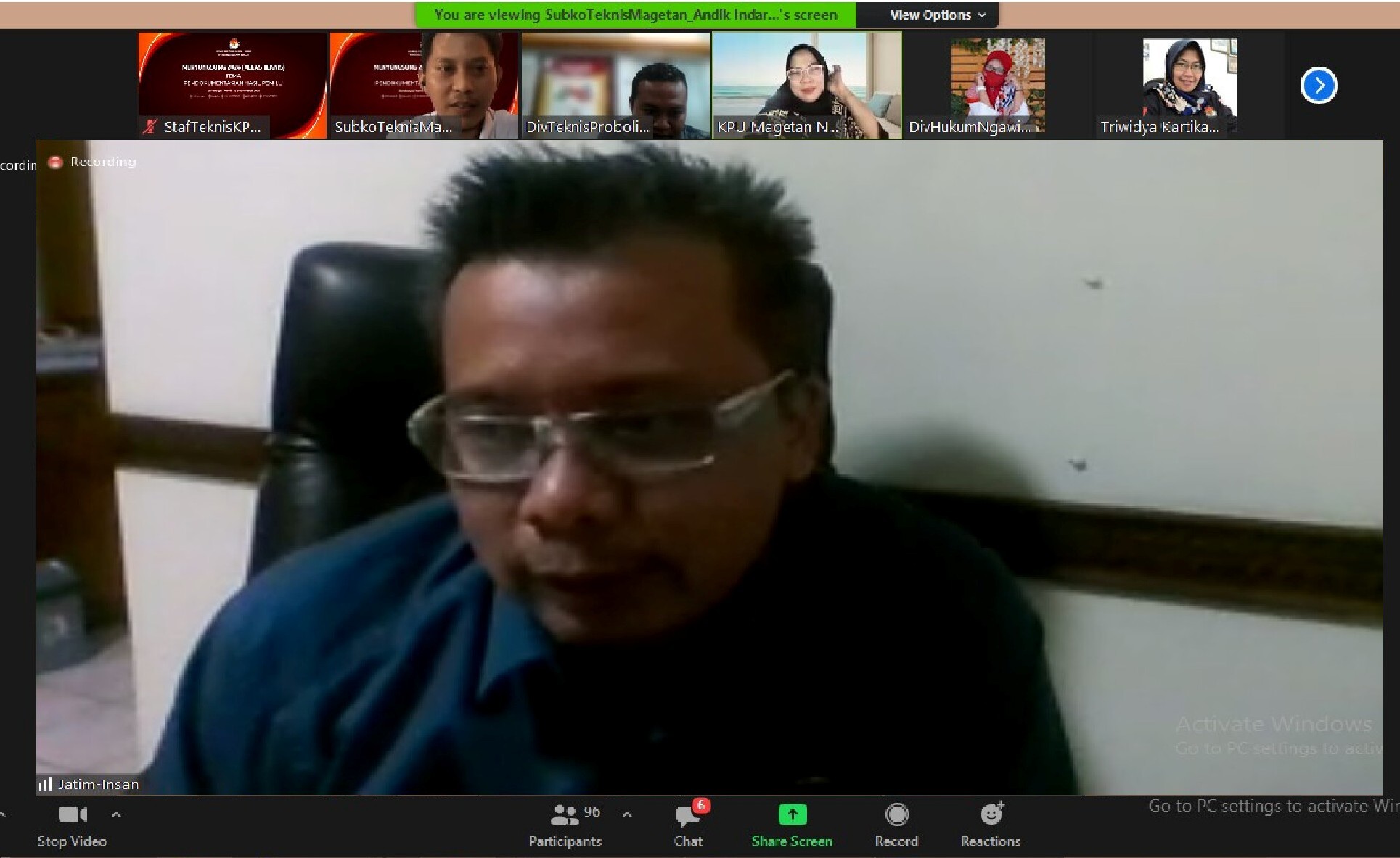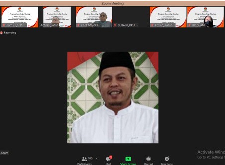 Kota Mojokerto – Muhammad Awaludin Zahroni, Divisi Sosdiklih Parmas dan SDM Komisi Pemilihan Umum Kota Mojokerto, bersama para Kasubbag dan staf, pada Jum’at, 17 September 2021mengikuti Program Knowledge Sharing Pembentukan Badan Adhoc untuk Pemilu dan Pemilihan Tahun 2024. Pada edisi kali ini kegiatan berbagi ilmu dan pengalaman mengambil tema “Seleksi Administrasi Pembentukan Badan Adhoc Untuk Pemilu dan Pemilihan Tahun 2024”.  Acara dimulai pukul 10.00 WIB dan dilaksanakan secara virtual ini dihadiri oleh Rochani, S.Pi. M.P., Divisi SDM dan Litbang KPU Provinsi Jawa Timur. Bertindak sebagai narasumber adalah, Aliwafa, M.Pd.I, Divisi Sosdiklih Parmas dan SDM KPU Kabupaten Probolinggo, sedangkan Subairi, Divisi Sosdiklih Parmas dan SDM Komisi Pemilihan Umum Kota Surabaya bertindak sebagai pembahas. Pada pemaparannya, Aliwafa menjelaskan bahwa berdasarkan Pasal 36 PKPU Nomor 36 Tahun 2018 tentang Perubahan Atas PKPU Nomor 3 Tahun 2015 tentang Pembentukan dan Tata Kerja Panitia Pemilihan Kecamatan, Panitia Pemungutan Suara, dan Kelompok Penyelenggara Pemungutan Suara disebutkan bahwa syarat  untuk menjadi PPK, PPS dan KPPS adalah mulai dari berstatu sebagai WNI, berumur di atas 17 tahun, tidak menjadi anggota partai politik, tidak terlibat menjadi tim sukses, hingga tidak berada dalam ikatan perkawinan dengan sesama penyelenggara Pemilu. Syarat tersebut harus dilengkapi dengan dokumen pendukung seperti KTP, Surat pernyataan setia kepada Pancasila sebagai dasar Negara, Undang-Undang Dasar Negara Republik Indonesia Tahun 1945, Negara Kesatuan Republik Indonesia, Bhinneka Tunggal Ika dan cita-cita Proklamasi 17 Agustus 1945, Surat pernyataan mempunyai integritas pribadi yang kuat, jujur dan adil, serta dokumen lainnya. Setelah materi selesai diurai, giliran Subagai sebagai pembahas memaparkan beberapa catatannya. Pada Pemilu terdahulu, Subairi menemukan banyak kesalahan ketika pendaftar menyerahkan berkas atau dokumen pendukung, mulai dari ijazah dilegalisir bukan oleh  lembaga/institusi berwenang seperti, kantor pos (leges),  notaris, ataupun pengadilan, hingga syarat surat sehat berasal dari klinik swasta (dokter umum/bidan). Selain itu subairi juga masih menemukan anggota dan pengurus parpol yang mendaftar sebagai penyelenggara adhoc. Pada akhir ulasannya, Subairi kemudian memberikan beberapa rekomendasi terkait dengan permasalahan yang ada, antara lain, pembatasan usia perlu ditinjau ulang, sertifikat vaksin sebagai pengganti keterangan sehat (rapid test), serta penyederhanaan dokumen administrasi (surat pernyataan). Pada sesi penutup, Rochani menekankan kepada KPU Kabupaten/Kota agar selalu berpedoman pada PKPU dalam proses penerimaan berkas atau dokumen administrasi persyaratan seleksi calon anggota PPK, PPS dan KPPS, para petugas juga harus berhati-hati dan teliti  dalam memverifikasi setiap dokumen.(sam)