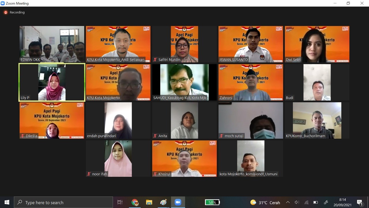Kota Mojokerto – Kegiatan KPU Kota Mojokerto hari Senin (20/09/2021) diawali dengan rutinitas apel pagi yang dilaksanakan tepat Pukul 08.00 WIB. Apel digelar secara virtual serta diisi dengan kegiatan pembacaan teks Pancasila dan Pembukaan UUD 1945. Bertindak sebagai petugas pembaca teks Pembukaan UUD 1945 adalah Anitawati, staf Subbag Keuangan, Umum, dan Logistik, sedangkan Muhammad Awaludin Zahroni, Anggota KPU Kota Mojokerto Divisi Sosdiklih, Parmas, dan SDM bertindak sebagai pembina apel. Apel pagi KPU Kota Mojokerto diikuti oleh seluruh jajaran komisioner, sekretaris, serta staf. Dalam amanat singkatnya, Zahroni mengucap syukur karena dari hari-kehari Pandemi Covid-19 menunjukkan tren penurunan yang signifikan. “Semoga situasi yang semakin baik ini menjadi pendorong semangat untuk kita bekerja serta senantiasa menjaga kekompakan”. Kegiatan apel ditutup dengan do’a yang dipimpin langsung oleh pembina apel. (sam)