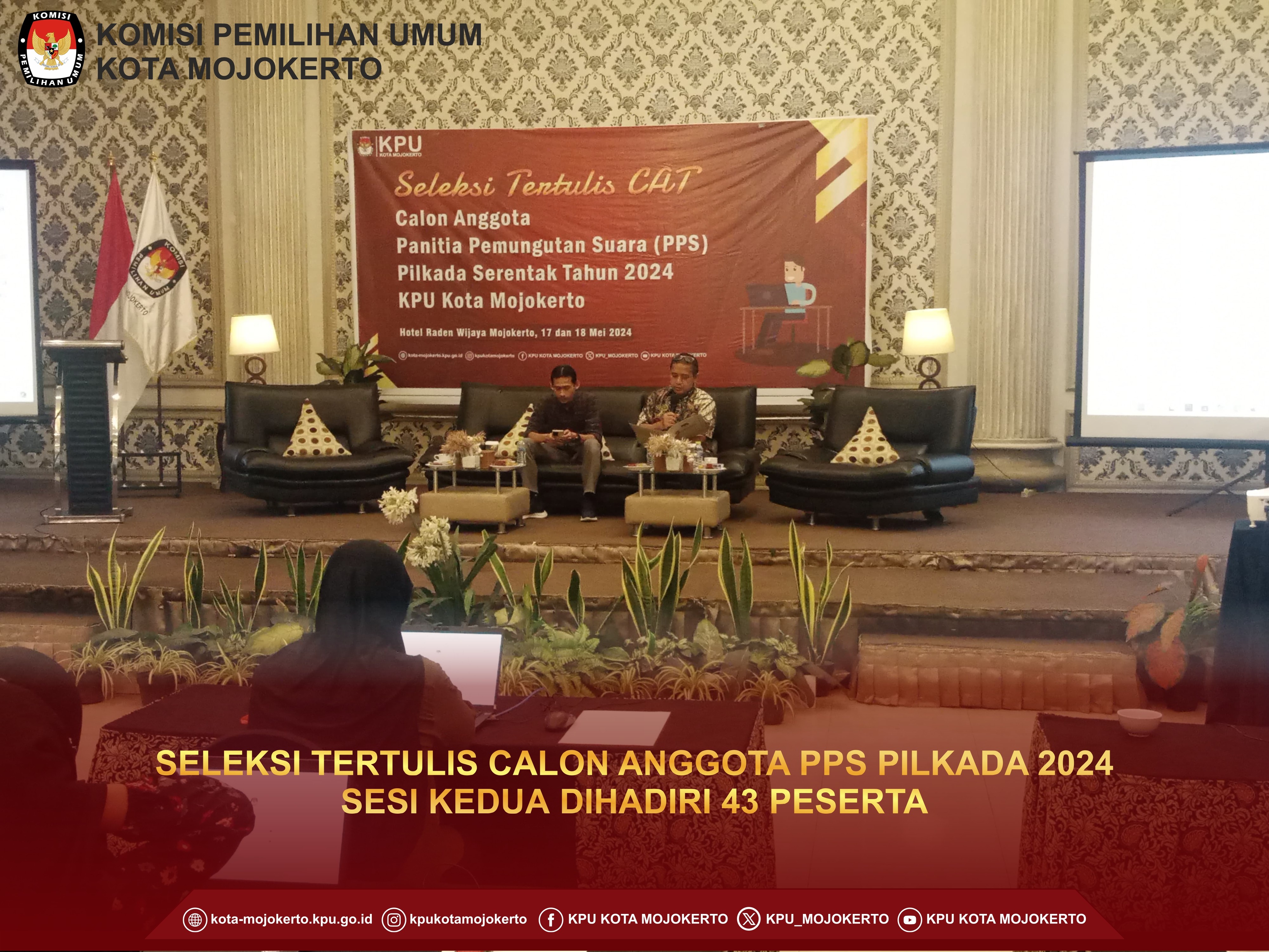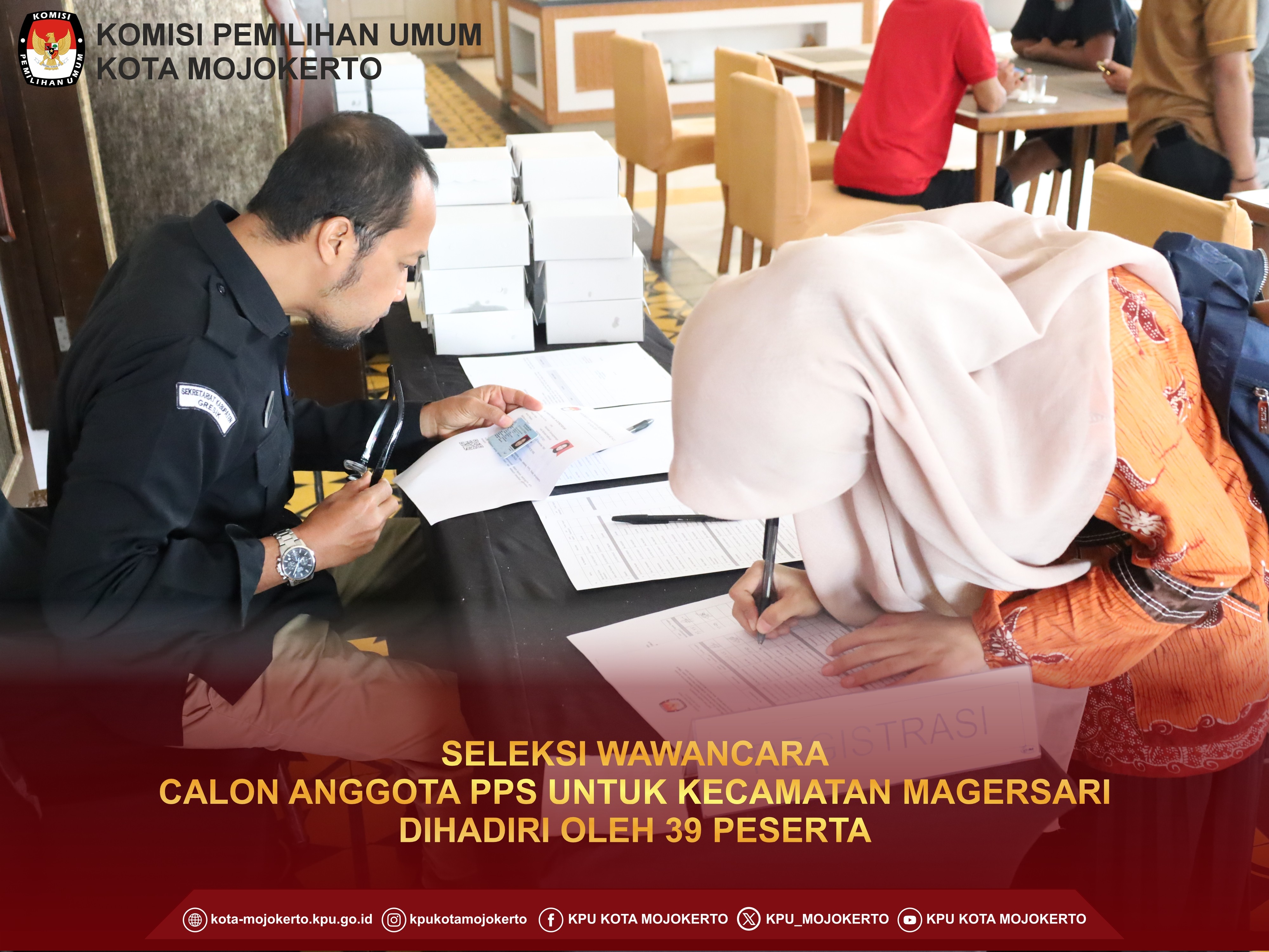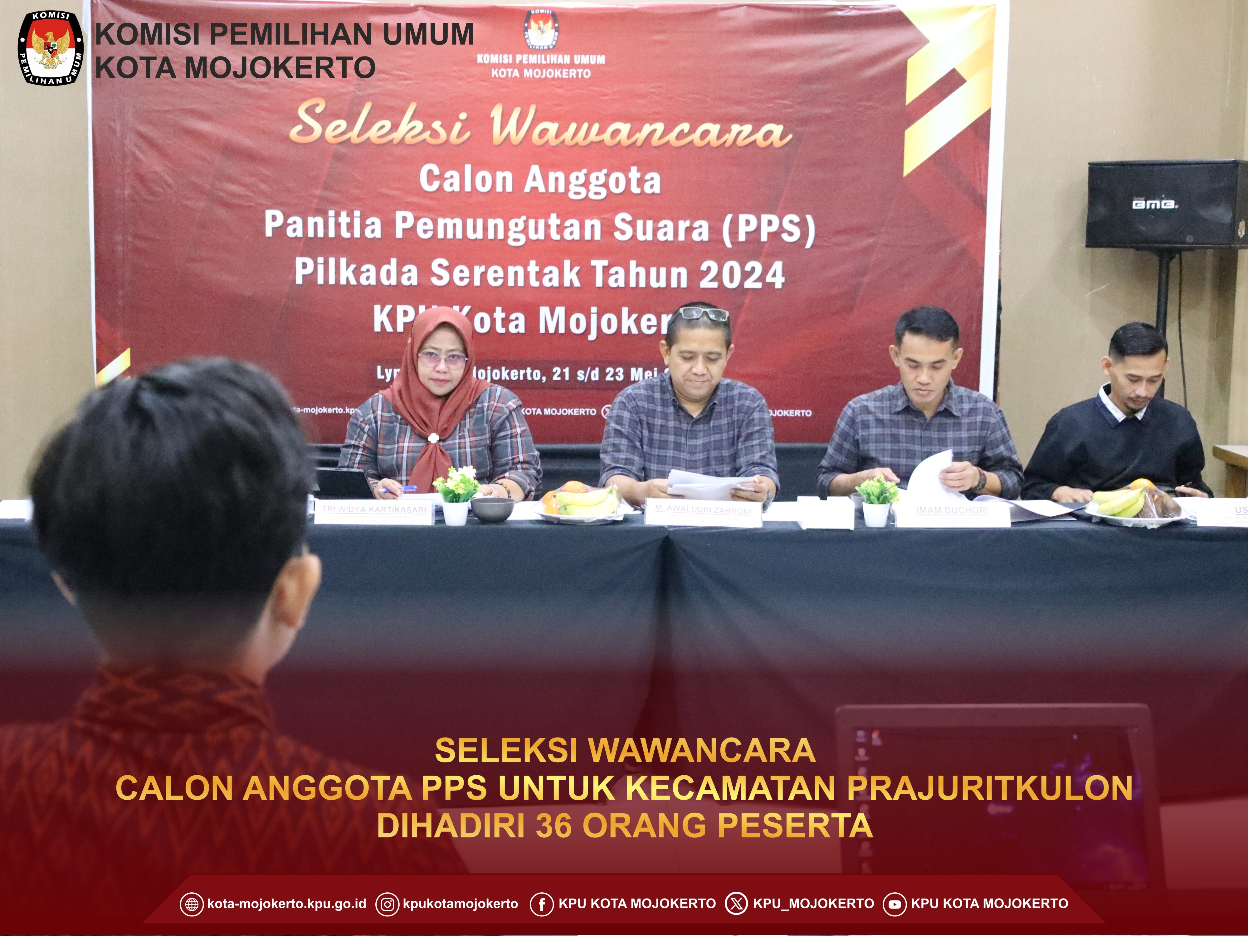 Mojokerto, kota-mojokerto.kpu.go.id - Hari ini Selasa pagi ini Komisi Pemilihan Umum (KPU) Kota Mojokerto melaksanakan tahapan seleksi wawancara untuk Calon Anggota Panitia Pemungutan Suara (PPS) di Hotel Lynn Mojokerto.(21/5/2024) Pelaksanaan tahapan ini sesuai dengan jadwalnya sudah ditetapkan melalui Keputusan KPU RI Nomor 476 tahun 2024. Untuk pelaksanaan seleksi wawancara untuk calon anggota PPS dikelompokkan menjadi 3 Kecamatan yang dibagi menjadi 3 hari, yaitu Kecamatan Prajuritkulon tanggal 21 Mei 2024, Kecamatan Magersari tanggal 22 Mei 2024, dan Kecamatan Kranggan 23 Mei 2024. Untuk sesi pertama pada hari ini adalah untuk Kelurahan yang berada di Kecamatan Prajuritkulon, yaitu Kelurahan Mentikan, Kauman, Pulorejo, Prajuritkulon, Surodinawan, dan Blooto. Dari peserta yang dinyatakan lolos melalui pengumuman KPU Kota Mojokerto Nomor 138/PP.04.2-Pu/3576/2024 Tentang Hasil Seleksi Tertulis Calon Anggota Panitia Pemungutan Suara Untuk Pemilihan Gubernur Dan Wakil Gubernur Provinsi Jawa Timur Serta Walikota Dan Wakil Walikota Mojokerto Tahun 2024. Setelah dilakukan registrasi untuk Kelurahan Mentikan, didapatkan seluruh peserta mengikuti wawancara sebanyak 5 orang. Untuk Kelurahan Kauman juga diikuti oleh seluruh peserta yaitu 6 orang. Untuk Kelurahan Pulorejo juga diikuti oleh seluruh peserta yaitu 4 orang. Untuk Kelurahan Prajuritkulon diikuti oleh 5 orang dan 1 orang tidak hadir. Untuk Kelurahan Surodinawan juga diikuti oleh seluruh peserta yaitu 9 orang. Dan untuk Kelurahan Blooto juga diikuti oleh seluruh peserta yaitu 7 orang. Total peserta yang mengikuti seleksi wawancara untuk Calon Anggota PPS di Kecamatan Prajuritkulon sebanyak 36 orang peserta.(hai)