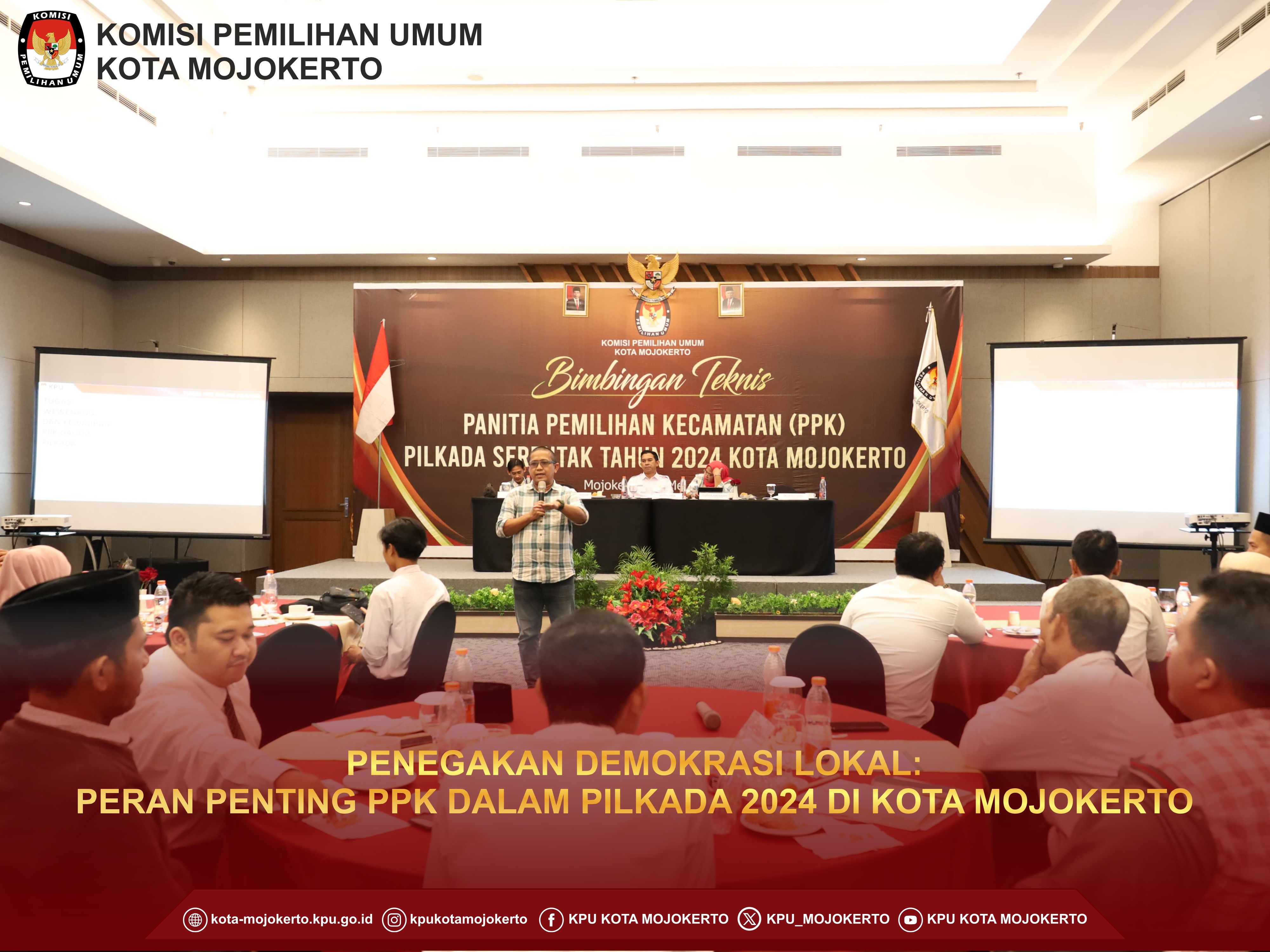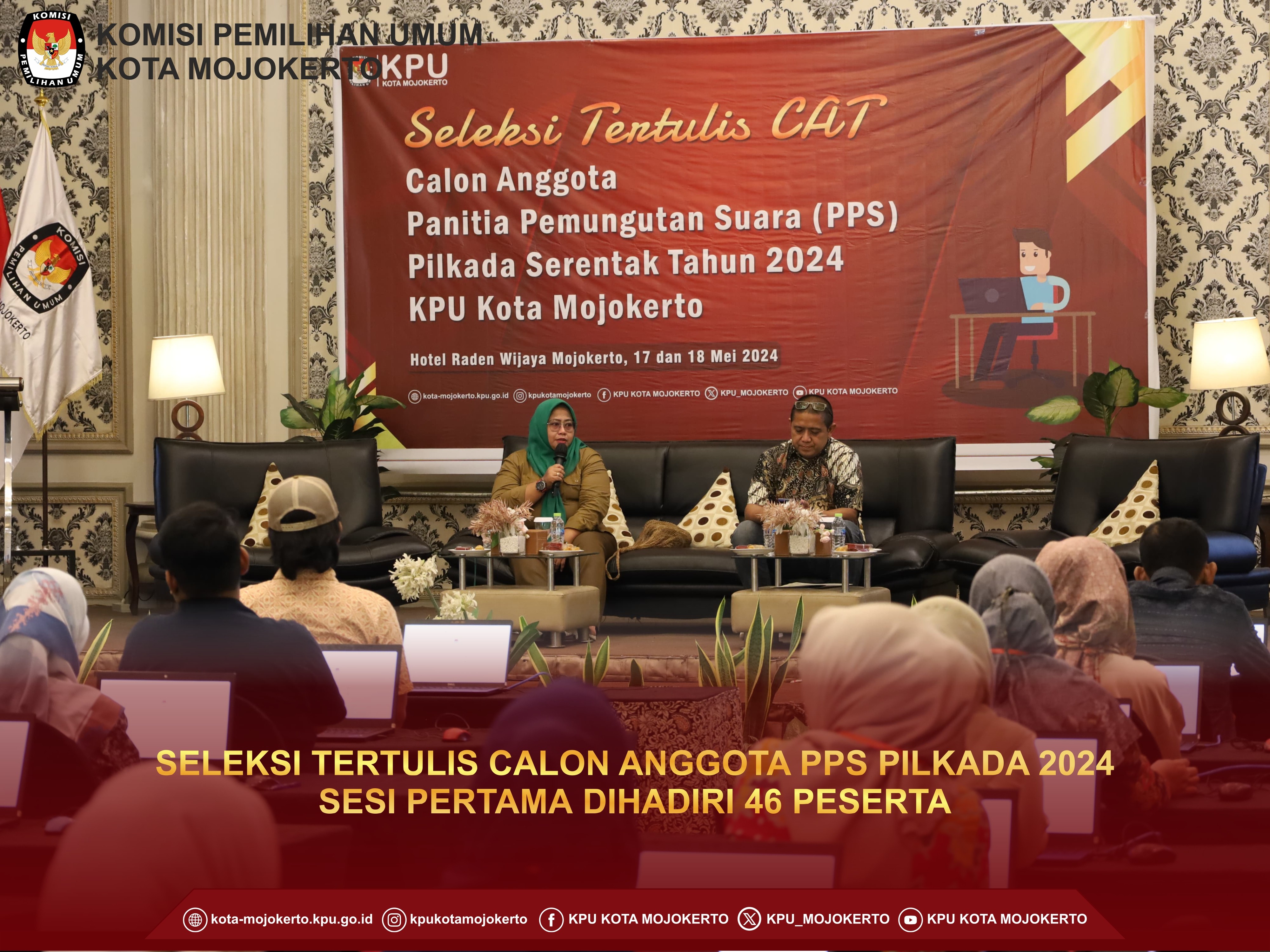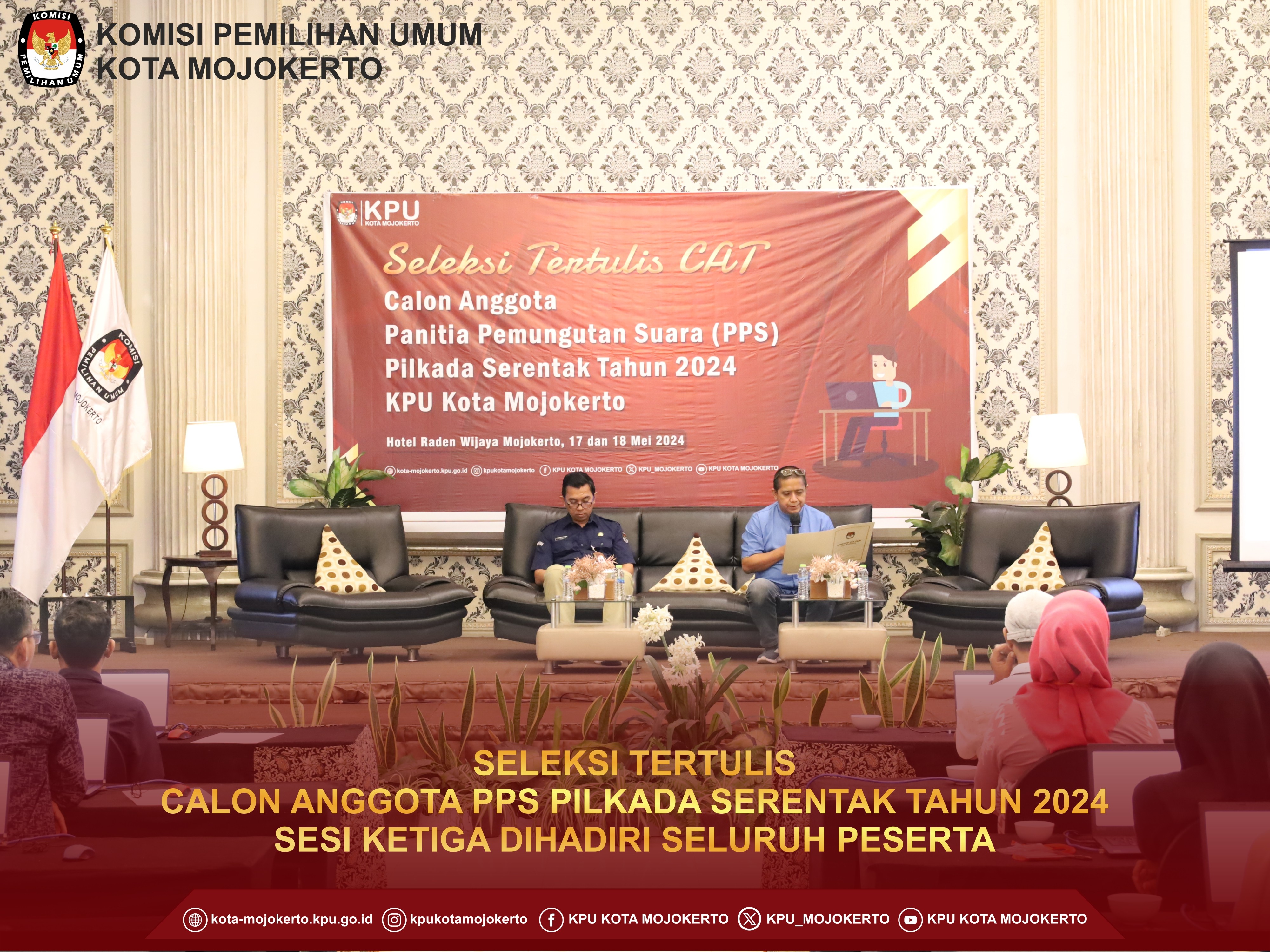 Mojokerto, kota-mojokerto.kpu.go.id - Hari ini Selasa pagi ini Komisi Pemilihan Umum (KPU) Kota Mojokerto melaksanakan tahapan seleksi wawancara untuk Calon Anggota Panitia Pemungutan Suara (PPS) di Hotel Lynn Mojokerto.(21/5/2024) Pelaksanaan tahapan ini sesuai dengan jadwalnya sudah ditetapkan melalui Keputusan KPU RI Nomor 476 tahun 2024. Untuk pelaksanaan seleksi wawancara untuk calon anggota PPS dikelompokkan menjadi 3 Kecamatan yang dibagi menjadi 3 hari, yaitu Kecamatan Prajuritkulon tanggal 21 Mei 2024, Kecamatan Magersari tanggal 22 Mei 2024, dan Kecamatan Kranggan 23 Mei 2024. Untuk sesi pertama pada hari ini adalah untuk Kelurahan yang berada di Kecamatan Prajuritkulon, yaitu Kelurahan Mentikan, Kauman, Pulorejo, Prajuritkulon, Surodinawan, dan Blooto. Dari peserta yang dinyatakan lolos melalui pengumuman KPU Kota Mojokerto Nomor 138/PP.04.2-Pu/3576/2024 Tentang Hasil Seleksi Tertulis Calon Anggota Panitia Pemungutan Suara Untuk Pemilihan Gubernur Dan Wakil Gubernur Provinsi Jawa Timur Serta Walikota Dan Wakil Walikota Mojokerto Tahun 2024. Setelah dilakukan registrasi untuk Kelurahan Mentikan, didapatkan seluruh peserta mengikuti wawancara sebanyak 5 orang. Untuk Kelurahan Kauman juga diikuti oleh seluruh peserta yaitu 6 orang. Untuk Kelurahan Pulorejo juga diikuti oleh seluruh peserta yaitu 4 orang. Untuk Kelurahan Prajuritkulon diikuti oleh 5 orang dan 1 orang tidak hadir. Untuk Kelurahan Surodinawan juga diikuti oleh seluruh peserta yaitu 9 orang. Dan untuk Kelurahan Blooto juga diikuti oleh seluruh peserta yaitu 7 orang. Total peserta yang mengikuti seleksi wawancara untuk Calon Anggota PPS di Kecamatan Prajuritkulon sebanyak 36 orang peserta.(hai)