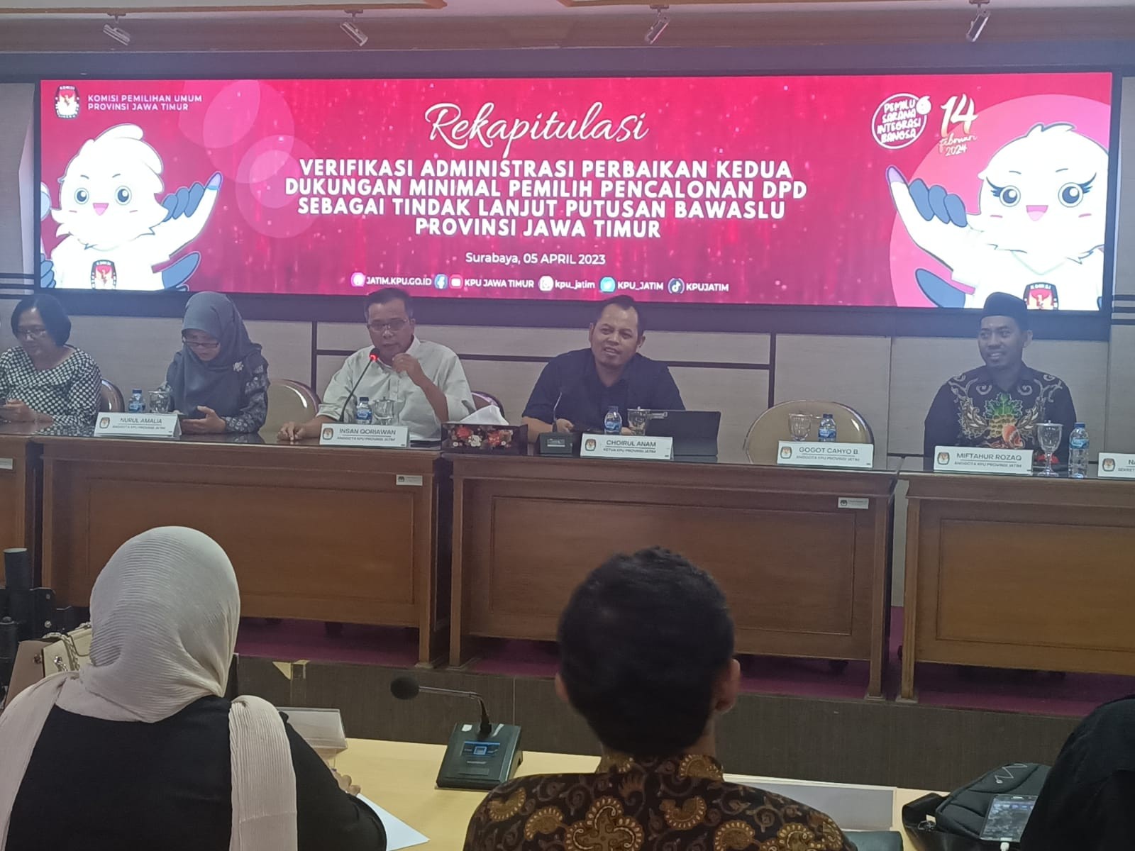 Ketua KPU Jatim, Choirul Anam saat membuka rapat pleno rekapitulasi menerangkan bahwa KPU Provinsi melakukan rekapitulasi hasil vermin perbaikan kedua setelah menerima berita acara hasil verifikasi administrasi perbaikan kedua kabupaten/kota.
