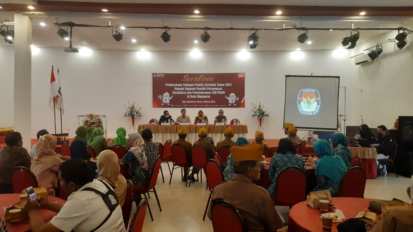 Mojokerto-kota-mojokerto.kpu.go.id- Upaya untuk memberikan pemahaman kepada masyarakat luas tentang konsep demokrasi dan Tahapan Pemilu Serentak Tahun 2024 terus dilakukan KPU Kota Mojokerto. Salah satunya adalah dengan menggelar kegiatan sosialisasi dengan sasaran segmen Pemilih Perempuan, Disabilitas dan Purnawirawan TNI/POLRI di Kota Mojokerto hari ini, Rabu (8/3), di RM. Djimbaran Resto.