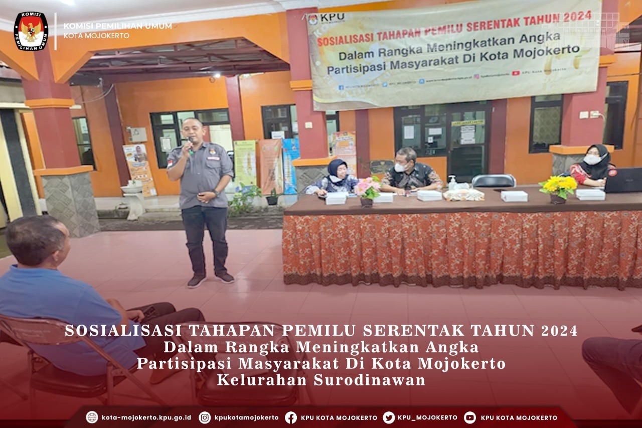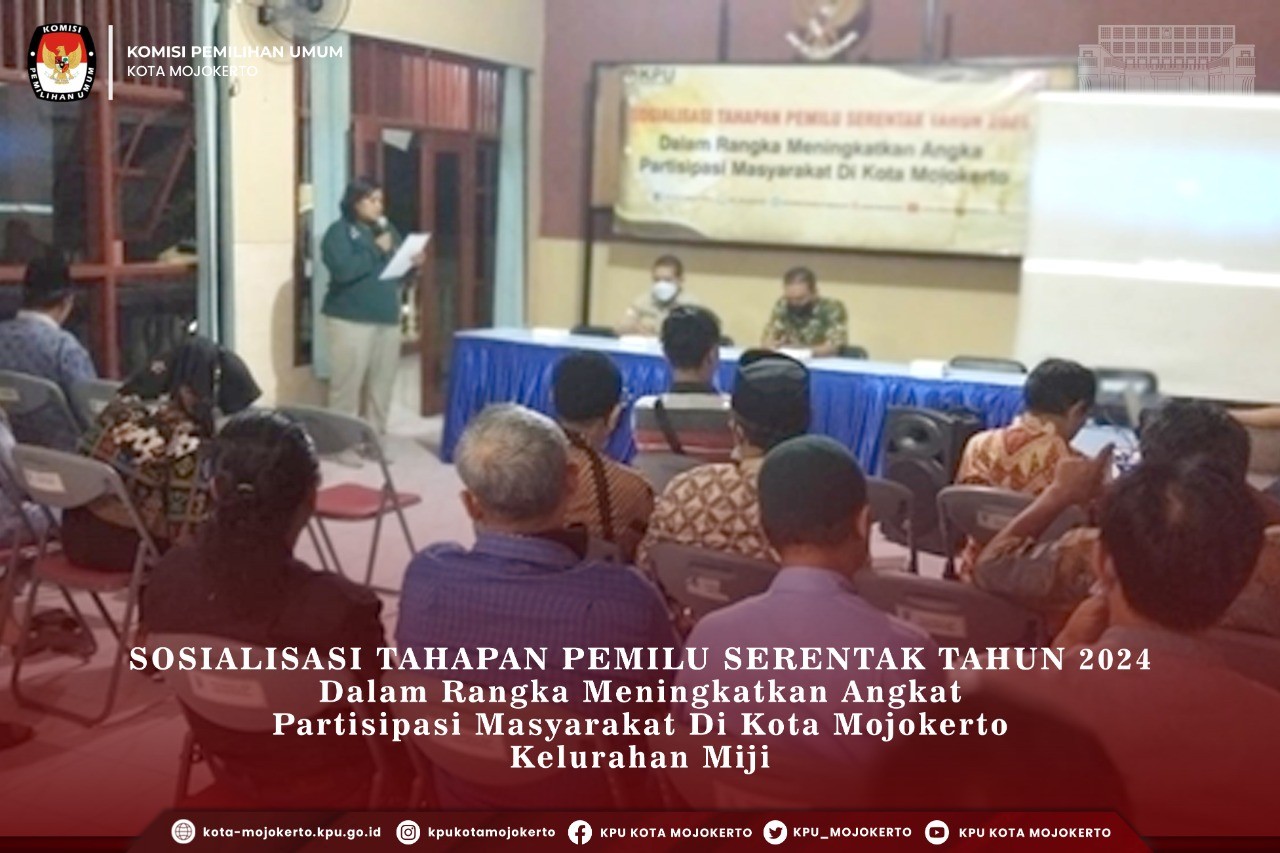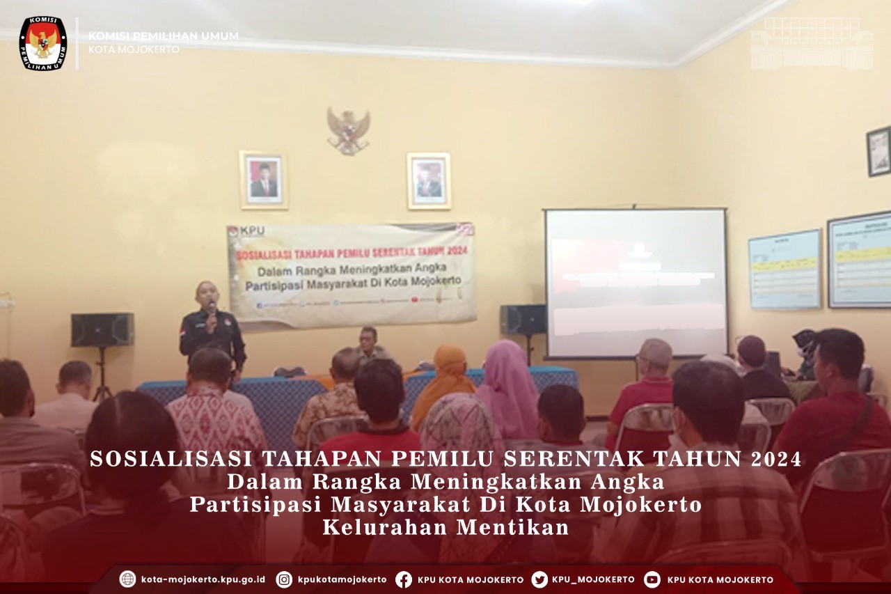 Mojokerto-kota-mojokerto.kpu.go.id- Upaya untuk memberikan pemahaman kepada masyarakat luas tentang konsep demokrasi dan Pemilu Serentak Tahun 2024 terus dilakukan KPU Kota Mojokerto. Salah satu upaya tersebut adalah dengan menggelar kegiatan sosialisasi ke setiap kelurahan di Kota Mojokerto. Kegiatan ini berjalan setelah sebelumnya KPU Kota Mojokerto menggelar serangkaian sosialisasi kepada calon pemilih pemula dihampir seluruh SMA/MA/SMK di Kota Mojokerto. Setelah digelar di Kelurahan Sentanan, Purwotengah, Prajuritkulon, Meri, Pulorejo, Kauman, Jagalan, Kranggan, Magersari, Wates, Blooto, Gunung Gedangan, Kedundung, Miji, Surodinawan dan Gedongan KPU Kota Mojokerto melanjutkan kegiatan safari sosialisasi di Kelurahan Mentikan pada Selasa malam (15/11). Pada sambutannya, M. Hery Kurniawan, SH selaku Lurah Mentikan menyampaikan terimakasih kepada seluruh peserta sosialisasi yang hadir, utamanya kepada KPU Kota Mojokerto yang sudah berkoordinasi dengan baik dengan pihak kelurahan. Terkait dengan program sosialisasi, Hery sangat mendukung segala bentuk kegiatan sosialisasi yang dilakukan oleh KPU Kota Mojokerto, pihaknya berharap agar antara KPU dengan kelurahan terjalin sinergitas dalam rangka menyukseskan Tahapan Pemilu 2024 dengan goal meningkatnya partisipasi masyarakat. Sementara itu dalam penyampaian materi sosialisasi, M. Awaludin Zahroni, Divisi Partisipasi, Hubungan Masyarakat dan SDM KPU Kota Mojokerto bersama tim menyampaikan tiga hal penting terkait tahapan Pemilu antara lain, pertama, Keputusan KPU RI Nomor 21 Tahun 2022 hari pemungutan suaranya ditetapkan tanggal 14 Februari 2024, kedua, saat ini berlangsung tahapan verifikasi administrasi perbaikan dokumen persyaratan keanggotaan parpol, ketiga, akan datang tahapan rekrutmen badan adhoc yang akan dilangsungakan pada pertengahan November 2022. Acara ditutup dengan dengan sesi diskusi, di mana banyak pertanyaan dari peserta baik itu terkait data pemutahiran data pemilih hingga persyaratan untuk menjadi penyelenggara adhoc, mulai dari KPPS, PPS hingga PPK. (sam)