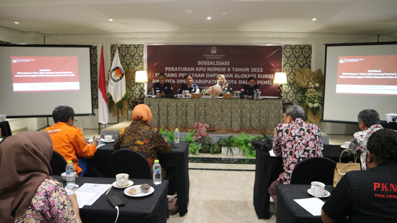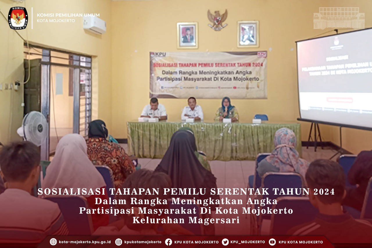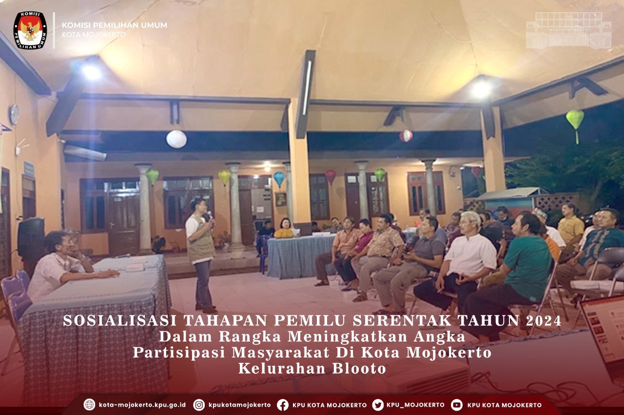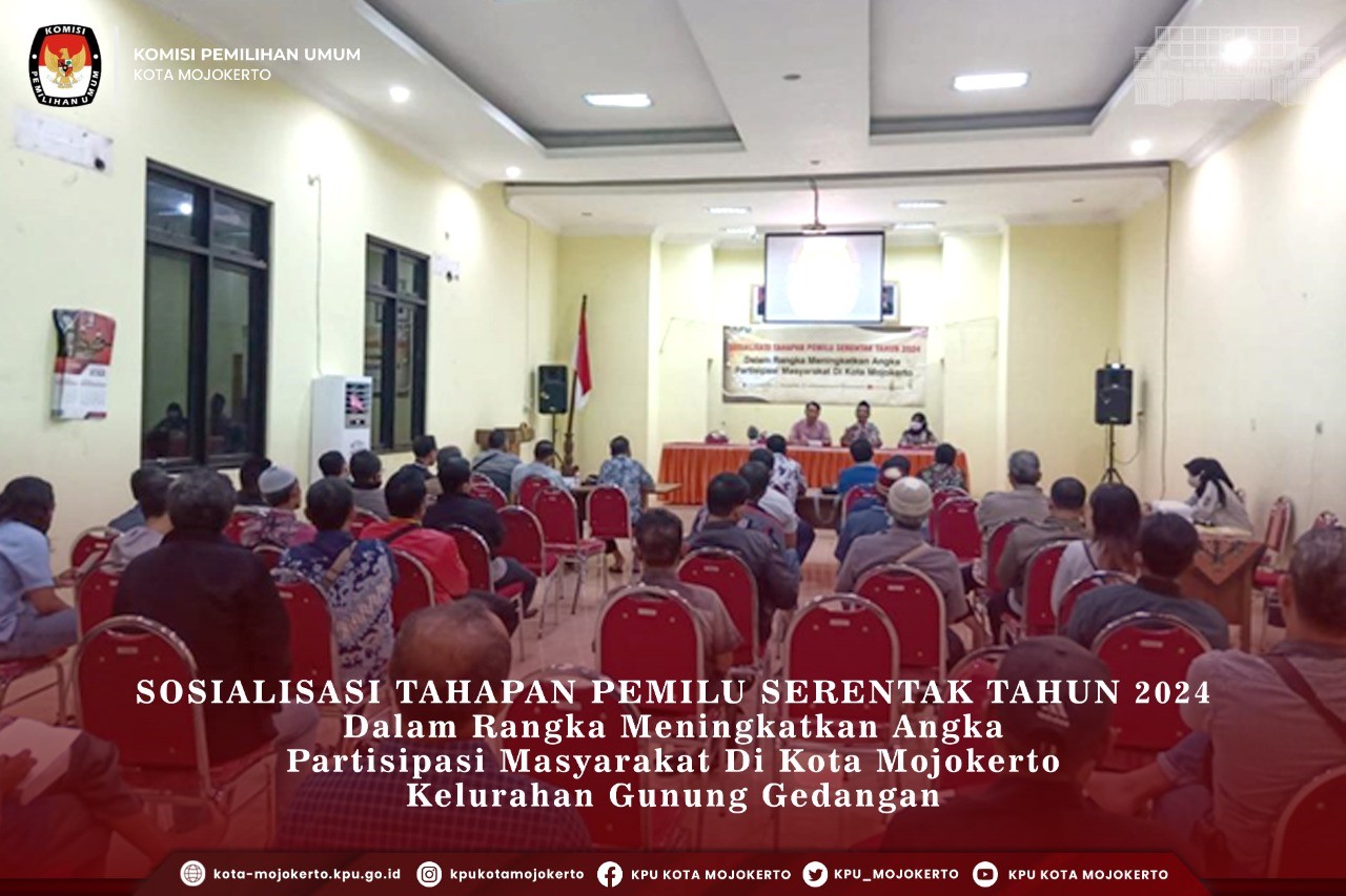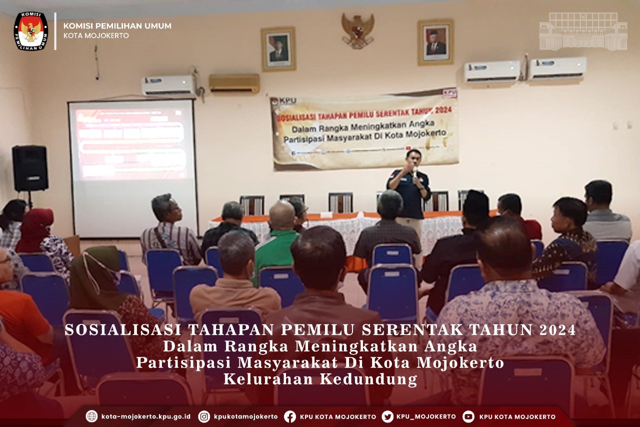 Mojokerto-kota-mojokerto.kpu.go.id- Upaya untuk memberikan pemahaman kepada masyarakat luas tentang konsep demokrasi dan Pemilu Serentak Tahun 2024 terus dilakukan KPU Kota Mojokerto. Salah satu upaya tersebut adalah dengan menggelar kegiatan sosialisasi ke setiap kelurahan di Kota Mojokerto. Kegiatan ini berjalan setelah sebelumnya KPU Kota Mojokerto menggelar serangkaian sosialisasi kepada calon pemilih pemula dihampir seluruh SMA/MA/SMK di Kota Mojokerto. Setelah digelar di Kelurahan Sentanan, Purwotengah, Prajuritkulon, Meri, Pulorejo, Kauman, Jagalan, Kranggan, Magersari, Wates, Blooto dan Gunung Gedangan KPU Kota Mojokerto melanjutkan kegiatan safari sosialisasi di Kelurahan Kedundung pada Selasa Malam (8/11). Pada sambutannya, Yukhal Mei Irawanto, SH, Lurah Kedundung menyampaikan terimakasih kepada seluruh peserta sosialisasi yang hadir, utamanya kepada KPU Kota Mojokerto yang sudah berkoordinasi dengan baik dengan pihak kelurahan. Terkait dengan program sosialisasi, Yukhal sangat mendukung segala bentuk kegiatan sosialisasi yang dilakukan oleh KPU Kota Mojokerto, pihaknya berharap agar antara KPU dengan kelurahan terjalin sinergitas dalam rangka menyukseskan Tahapan Pemilu 2024 dengan goal meningkatnya partisipasi masyarakat. Sementara itu dalam penyampaian materi sosialisasi, Imam Buchori, Divisi Hukum dan Pengawasan KPU Kota Mojokerto bersama tim menyampaikan tiga hal penting terkait tahapan Pemilu antara lain, pertama, Keputusan KPU RI Nomor 21 Tahun 2022 hari pemungutan suaranya ditetapkan tanggal 14 Februari 2024, kedua, saat ini berlangsung tahapan verifikasi administrasi perbaikan dokumen persyaratan keanggotaan parpol, ketiga, akan datang tahapan rekrutmen badan adhoc yang akan dilangsungakan pada pertengahan November 2022. Acara ditutup dengan dengan sesi diskusi, di mana banyak pertanyaan dari peserta baik itu terkait data pemutahiran data pemilih hingga persyaratan untuk menjadi penyelenggara adhoc, mulai dari KPPS, PPS hingga PPK. (sam)
