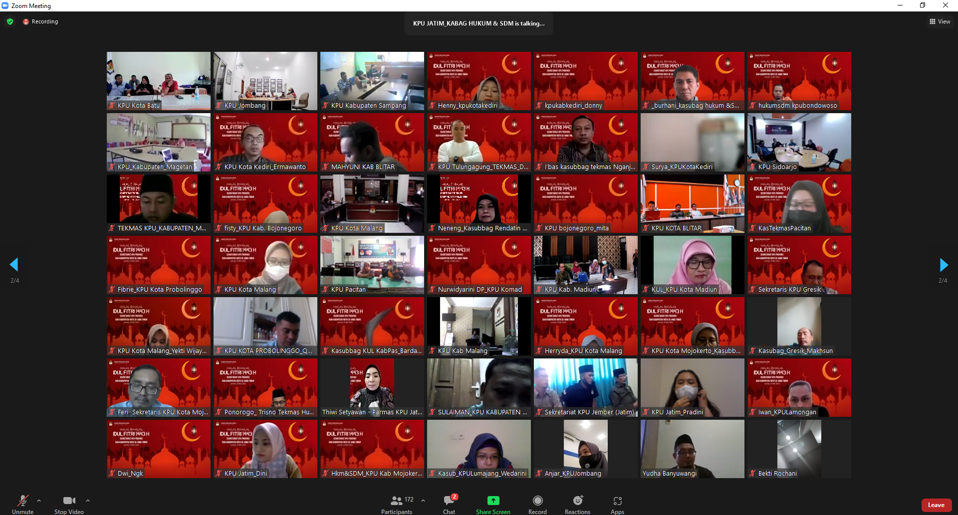 Kegiatan yang diselenggarakan oleh KPU Provinsi Jawa Timur ini digelar secara daring melalui aplikasi zoom meeting dan diikuti oleh Divisi Sosdiklih, Parmas dan SDM serta Kasubbag Hukum dan SDM dari seluruh KPU Kabupaten/Kota se-Jawa Timur. KPU Kota Mojokerto diwakili oleh komisioner Divisi Sosdiklih, Parmas dan SDM, M.A Zahroni, beserta Kasubbag Hukum dan SDM, Noor Ifah. Rapat Konsolidasi ini dihadiri pula oleh Komisioner KPU Provinsi Jatim Divisi Data dan Informasi, Nurul Amalia dan Sekretaris KPU Provinsi Jatim, Nanik Karsini. Bertindak sebagai narasumber, komisioner KPU Provinsi Jatim Divisi SDM dan Litbang, Rochani, serta Kabag Perencanaan, Data dan Informasi KPU Provinsi Jatim, Nurita Paramita.
