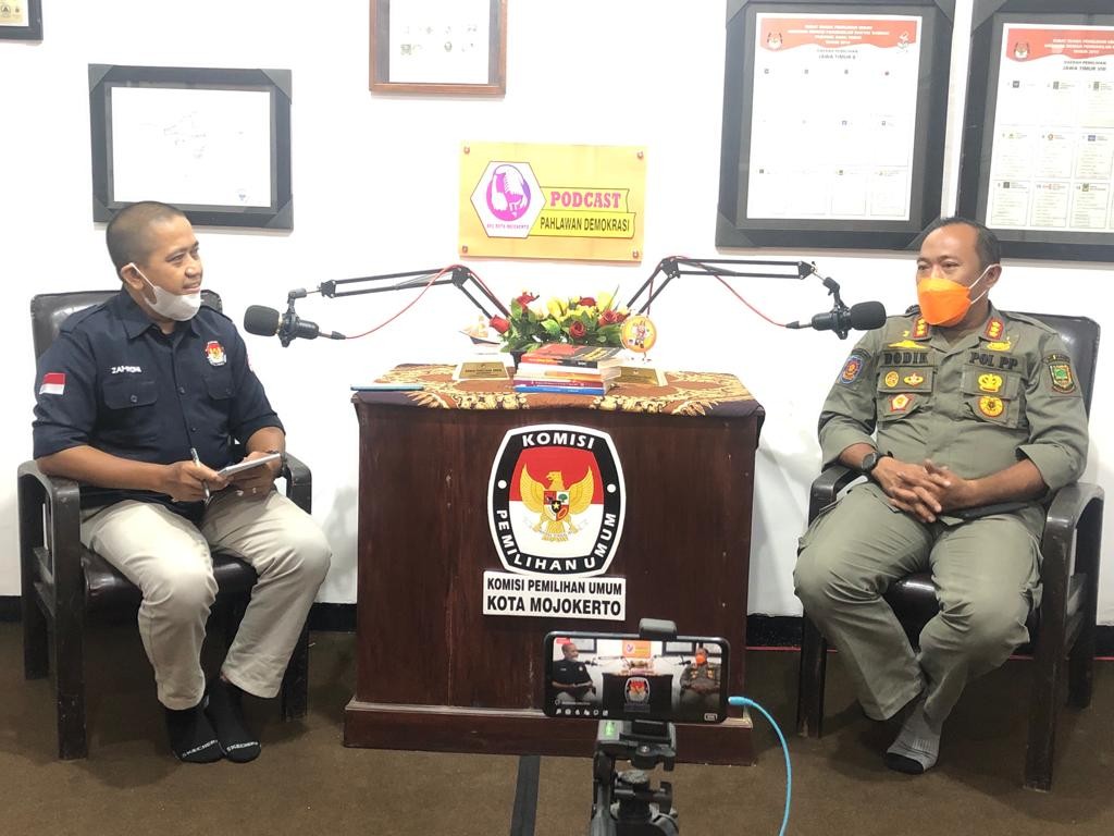 KOTA MOJOKERTO – Ditengah kesibukan mengikuti berbagai kegiatan persiapan jelang tahapan Pemilu dan Pemilihan Serentak 2024, KPU Kota Mojokerto pada Selasa (12/10) menggelar dialog khusus melalui "Pahlawan Demokrasi Podcast". Podcast kali ini mengambil topik “Kesiapan Petugas Ketertiban TPS (Linmas) Dalam Rangka Menyambut Pemilu dan Pemilihan Serentak Tahun 2024.”  Acara yang dipandu oleh Muhammad Awaludin Zahroni (Anggota KPU Kota Mojokerto) secara khusus menghadirkan Heryana Dedik Murtono, SSTP, M.Si,  Kepala Satuan Polisi Pamong Praja (Satpol PP) Kota Mojokerto sebagai narasumber. Pada awal dialog, Zahroni menyampaikan bahwa berdasarkan  pemetaan awal, KPU Kota Mojokerto memproyeksi pada 2024 nanti terdapat sekitar 430 TPS yang memerlukan pengamanan. Menanggapi apa yang disampaikan oleh Zahroni, Dedik menuturkan jika Pemilu serentak 2024 merupakan pengalaman pertama bagi penyelenggara termasuk petugas pengamanan, dimana pemilu dan pilkada dilaksanakan ditahun yang sama. Berkaca dari penyelenggaraan pemilu sebelumnya, pihaknya juga memastikan bahwa beban pengamanan pemilu mendatang pasti jauh lebih berat. Sebelum masuk lebih dalam membahas topik utama podcast, Dedik terlebih dahulu menjelaskan jika Satpol PP yang membawahi Linmas memiliki kewajiban untuk membina Linmas, “Tugas Linmas bukan saat pemilu saja, Linmas memiliki banyak tugas pokok antara lain, membantu menanggulangi bencana baik alam maupun non alam, membantu pelaksanaan pemilu, serta membantu pelaksanaan trantibhum yang ada diwilayah kerja masing-masing satuan,” urai Dedik. Terkait dengan 2024, pihaknya mengaku sudah menyiapkan satuan tugas dengan koordinator dimasing-masing kelurahan. “Secara ideal Linmas dimasing-masing RW ada dua orang personil Linmas, kemarin kita libatkan dalam kegiatan tracking Covid-19 dimana kegiatan ini merupakan salah satu bentuk konsolidasi pada tiga fungsi pokok tadi,” ujar Dedik. Sementara itu, saat ditanya tentang kesiapan SDM Dedik secara tegas menyebut jika pihaknya sudah sangat siap, “Nantinya ada proses seleksi untuk melihat potensi personil yang siap melaksanakan pengamanan pemilu, proses seleksi menyangkut faktor netralitas, kesehatan personil dan usia,” jelas Dedik. Mengenai adanya potensi pemilu dilaksanakan ditengah pandemi, pihaknya juga mengaku cukup siap, mengingat selama ini para petugas memiliki pegalaman dilibatkan dalam kegiatan tracking Covid-19.  (sam)