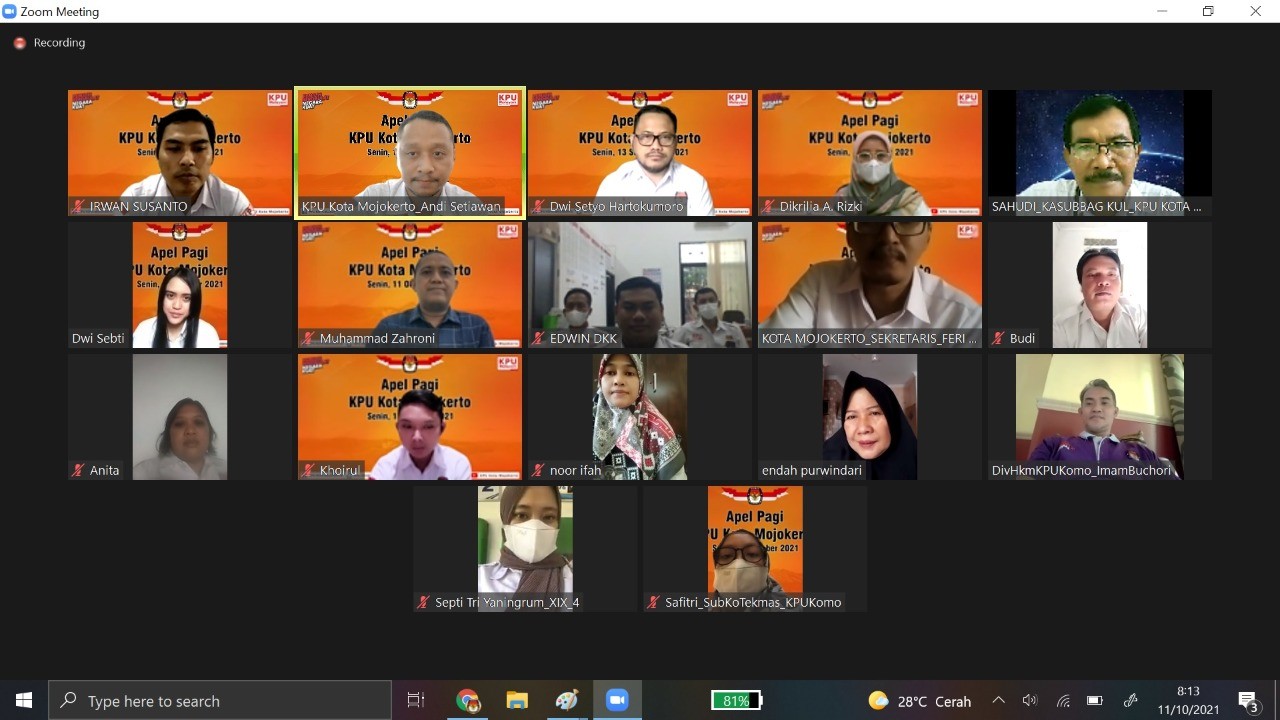 Kota Mojokerto- KPU Kota Mojokerto melaksanakan apel pagi rutin, Senin (11/10/2021), apel rutin kali ini dilaksanakan melalui zoom meeting, pada pelaksanakan pagi ini di ikuti oleh komisioner KPU Kota Mojokerto, Sekretaris KPU Kota Mojokerto serta staf KPU Kota Mojokerto. Dalam apel rutin pagi ini Feri Setiawan selaku Sekretaris KPU Kota Mojokerto bertindak sebagai penerima apel, Ia menghimbau kepada seluruh jajaran KPU Kota Mojokerto untuk tetap mematuhi protokol kesehatan meskipun sedang melaksanakan Work From Home (WFH), terutama bagi yang sedang melaksanakan Work From Office (WFO). Lebih lanjut Ia menyampaikan ucapan terima kasih kepada seluruh staf KPU Kota Mojokerto yang sudah melaksanakan tugasnya dengan sepenuh hati dan juga sudah mengerjakan tugas sesuai dengan waktu yang sudah di tentukan. Tidak lupa Feri juga menghimbau kepada seluruh staf di KPU Kota Mojokerto "bagi yang punya tanggungan pekerjaan, agar segera menyelesaikan pekerjaannya sehingga dapat terpenuhi tepat pada waktunya", pungkasnya. (EHK)