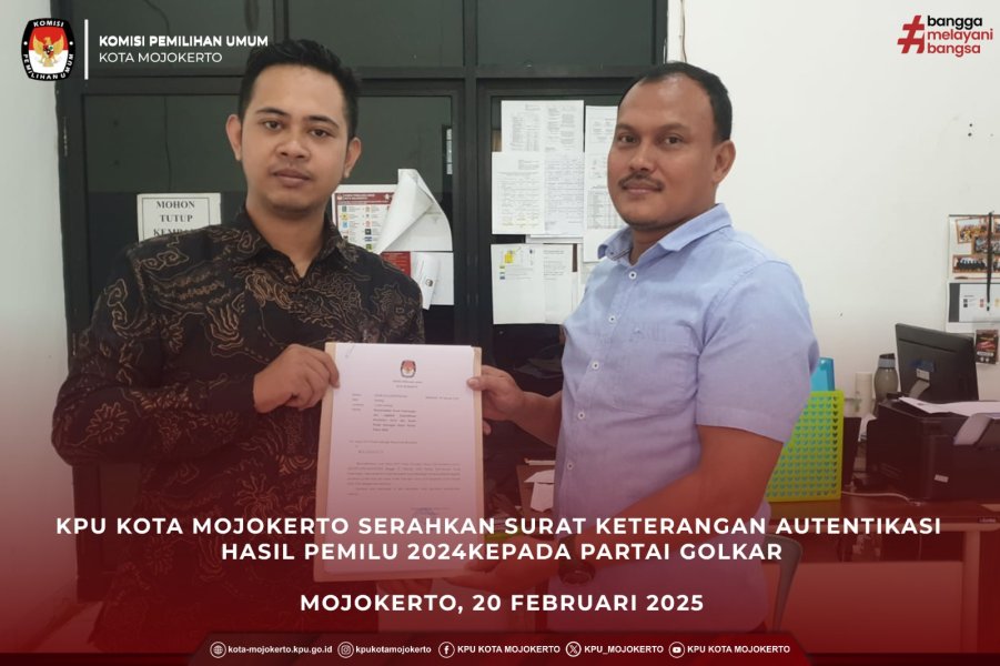 Mojokerto, kota-mojokerto.kpu.go.id – KPU Kota Mojokerto memberikan pelayanan kepada Petugas Penghubung Partai Golkar Kota Mojokerto yang akan memproses dana bantuan keuangan untuk partai politik dari pemerintah pada Kamis (20/2). Sebagaimana ketentuan Pasal 16 ayat (3) huruf c Peraturan Menteri Dalam Negeri Republik Indonesia Nomor 36 Tahun 2018 Tentang Tata Cara Penghitungan, Penganggaran dalam Anggaran Pendapatan dan Belanja Daerah, dan Tertib Administrasi Pengajuan, Penyaluran, dan Laporan Pertanggungjawaban Penggunaan Bantuan Keuangan Partai Politik, Partai Politik Tingkat Daerah Kabupaten/Kota mengajukan surat permohonan bantuan keuangan partai politik kepada Bupati/Walikota dengan melampirkan sebanyak 2 (dua) rangkap kelengkapan administrasi berupa surat keterangan autentifikasi hasil penetapan perolehan kursi dan suara partai politik hasil pemilihan umum DPRD Kabupaten/Kota yang dilegalisir oleh Sekretaris Komisi Pemilihan Umum kabupaten/kota. Penerbitan Surat Keterangan Autentikasi hasil penetapan perolehan kursi dan suara partai Politik Golkar hasil Pemilu 2024 didasarkan pada surat permohonan oleh partai tertanggal 17 Februari 2024. Penyerahan Surat Keterangan Autentikasi dilakukan oleh Kasubbag Teknis Penyelenggaraan dan Hukum kepada Petugas Penguhubung. Kegiatan ini sebagai salah satu bentuk pelayanan KPU kepada Masyarakat disamping melaksanakan tahapan Pemilu dan Pemilihan Serentak. Sebagaimana diketahui bersama partai Golkar Kota Mojokerto dalam Pemilu 2024 menempatkan dua calegnya duduk di kursi DPRD Kota Mojokerto. Keduanya adalah AGUS WAHJUDI UTOMO, A.Md. dari Dapil Kota Mojokerto 1 dan dr. DITHA ROOSITA AYU LESTARI, M .Biomed. dari Dapil Kota Mojokerto 2. Dalam Pemilu 2024 Partai Golkar Kota Mojokerto meraup total perolehan suara sebesar 10.352 (Sepuluh Ribu Tiga Ratus Lima Puluh Dua). (msa)