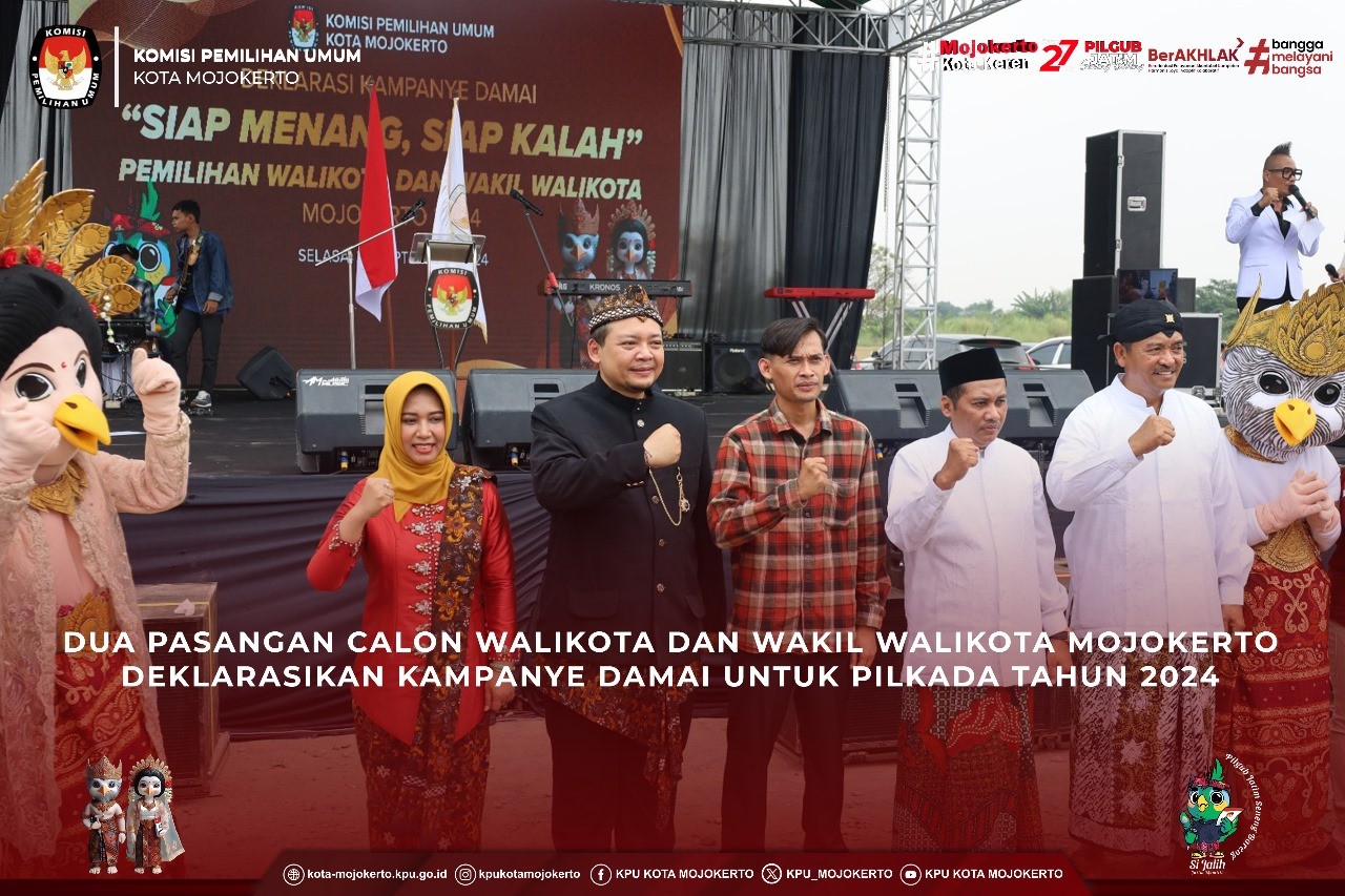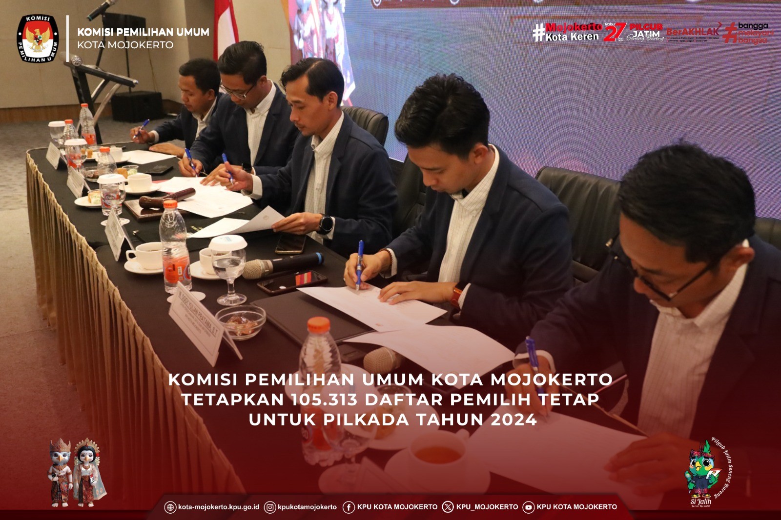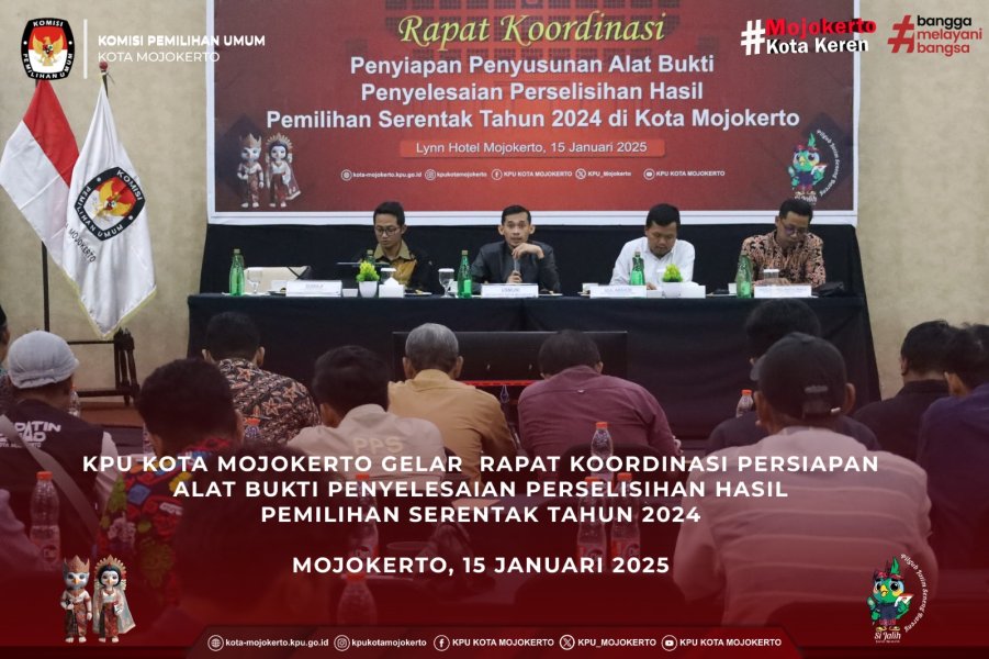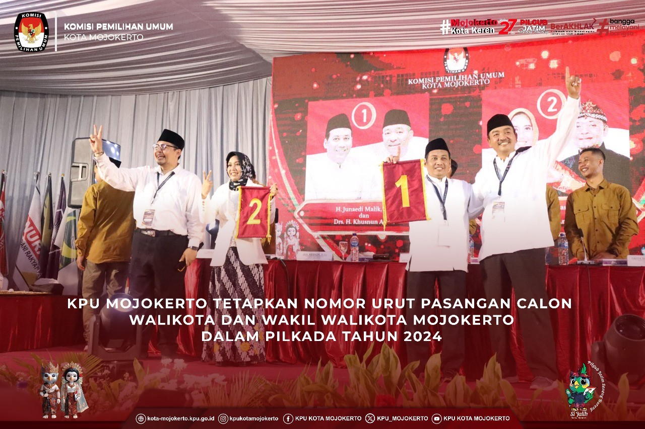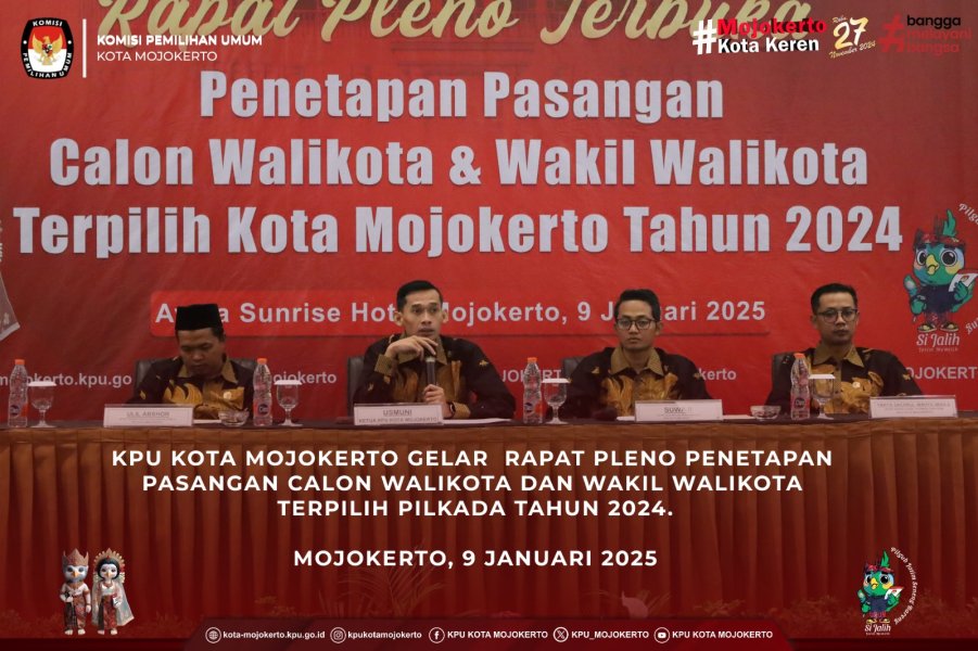Mojokerto, kota-mojokerto.kpu.go.id - Komisi Pemilihan Umum (KPU) Kota Mojokerto menggelar Rapat Pleno Terbuka Penetapan Pasangan Calon Walikota dan Wakil Walikota Terpilih Pilkada Tahun 2024 di Ayola Sunrise Hotel, Kamis, (9/1/2025). Memimpin rapat pleno terbuka Ketua KPU Kota Mojokerto Usmuni, Anggota KPU Kota Mojokerto Suwaji, Ulil Abshor, Yahya Sachrul Wahyu Iman Asyidiq dan khusus untuk Muhammad Oggy Yulian Pratama melalui daring, bersama Sekretaris KPU Kota Mojokerto Wiratmoko Iman Santoso. Rapat pleno ini menetapkan Pasangan Calon Walikota dan Wakil Walikota Mojokerto Nomor Urut 2, Ika Puspitasari dan Dr. Rachman Sidharta Arisandi, S.IP., M.Si. sebagai Pasangan Calon Walikota dan Wakil Walikota Terpilih Kota Mojokerto Tahun 2024. Selanjutnya berlangsung penyerahan Salinan Keputusan KPU Kota Mojokerto kepada DPRD Kota Mojokerto, Partai Politik Peserta Pemilu atau Gabungan Partai Politik Peserta Pemilu yang mengusulkan Pasangan Calon, Pasangan Calon terpilih, KPU, dan Bawaslu Kota Mojokerto. Turut hadir Pasangan Calon Walikota dan Wakil Walikota Nomor Urut 2, Ketua dan/atau Sekretaris Partai Politik Peserta Pilkada Tahun 2024, jajaran Forkopimda Kota Mojokerto, Pemantau Pilkada Tahun 2024, Anggota Bawaslu Kota Mojokerto dan PPK se-Kota Mojokerto.(hai/ifa)