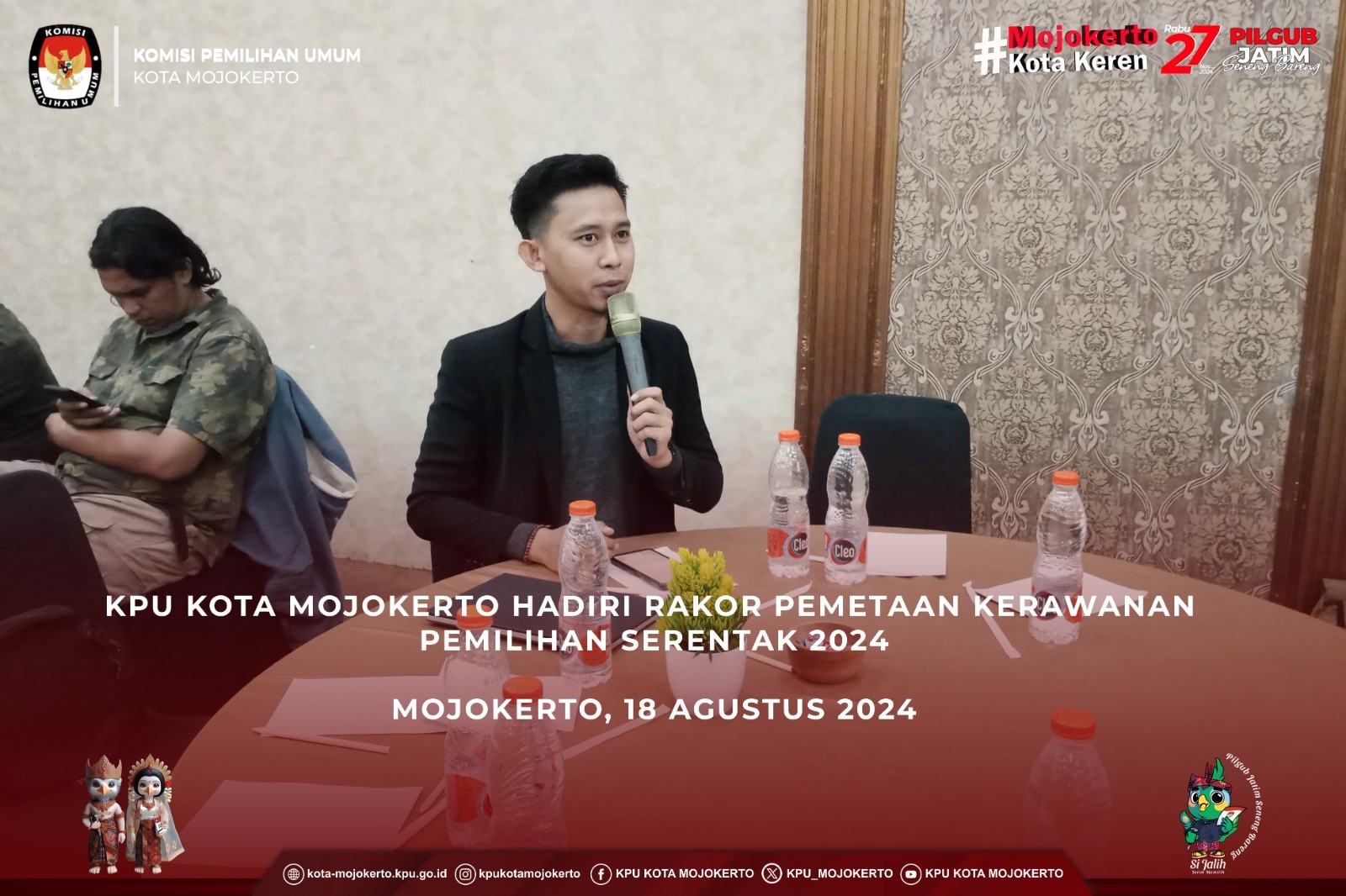Mojokerto, kota-mojokerto.kpu.go.id – KPU Kota Mojokerto menghadiri Rapat Koordinasi Bersama Stakeholder dan Lauching Pemetaan Kerawanan Pemilihan Serentak 2024 yang diselenggarakan oleh Bawaslu Kota Mojokerto, Minggu (18/08). Rakor ini merupakan salah satu upaya untuk menguatkan sinergi antara penyelenggara pemilu dan para stakeholder terkait, sekaligus sebagai forum diskusi untuk memperjelas tanggung jawab masing-masing pihak dan meningkatkan pemahaman tentang peran mereka dalam memastikan integritas pemilu. Dalam acara tersebut, KPU Kota Mojokerto diwakili Divisi Perencanaan Data dan Informasi, Muhammad Oggy Yulian Pratama.