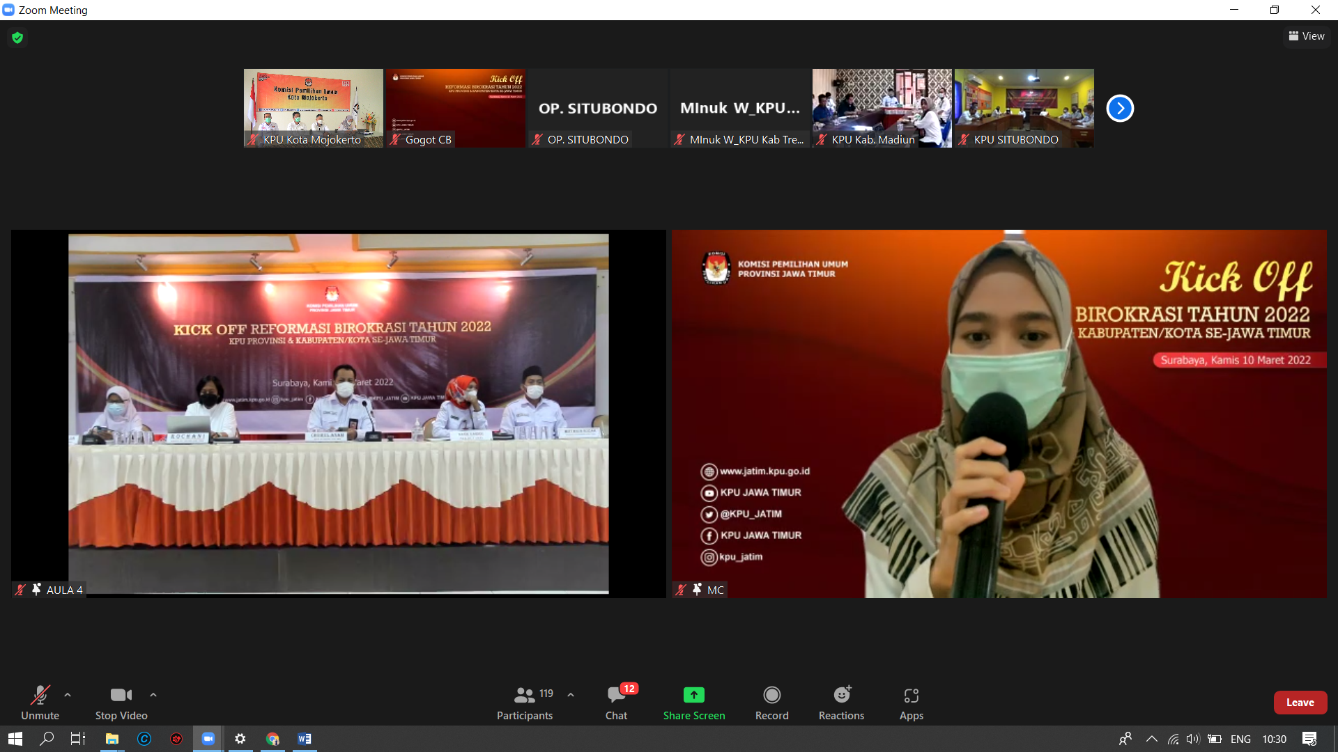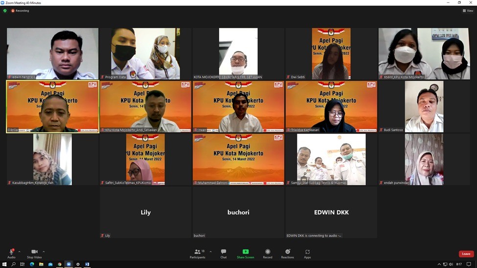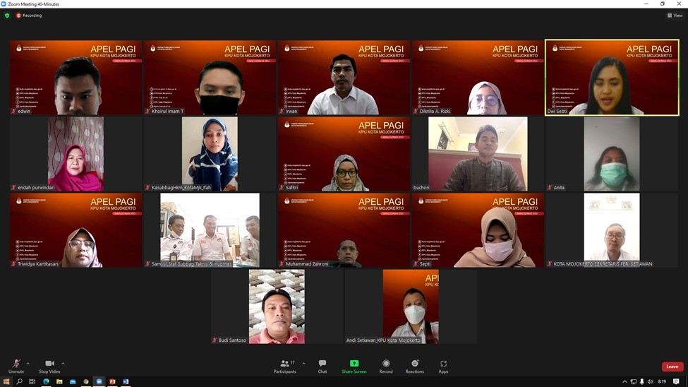 Kota Mojokerto - KPU Kota Mojokerto tetap melaksanakan kegiatan rutin apel pagi meski Kota Mojokerto berstatus PPKM Level 2, Senin (21/3). Kegiatan yang dipimpin oleh Imam Buchori, Anggota KPU Kota Mojokerto diisi dengan pembacaan teks Pancasila dan Pembukaan UUD 1945 dan dimulai tepat Pukul 08.00 WIB. Kegiatan yang dilaksanakan full daring diikuti oleh seluruh jajaran KPU Kota Mojokerto mulai dari komisioner, sekretaris, kasubbag, hingga staf. Sementara itu dalam amanat singkatnya, imam sapaan akrabnya kembali mengingatkan kepada seluruh keluarga besar KPU Kota Mojokerto agar tepa fokus menyiapakan setiap tahapan pemilu serentak tahun 2024 dengan baik."Meskipun ada dinamika isu terkait dengan penundaan pemilu, kita sebagai penyelenggara jangan terlalu terpengaruh, kita harus tetap fokus pada tugas dan fungsi untuk menyiapkan tahapan dengan sebaik-baiknya", pesan Imam. Sebelum menutup apel dengan do'a, Imam mengingatkan untuk etap menjaga kesehatan dan kekompakan. Setelah penyampaian amanat, kegiatan kemudian ditutup dengan do’a yang dipimpin langsung oleh pemimpin apel. (win/sam)