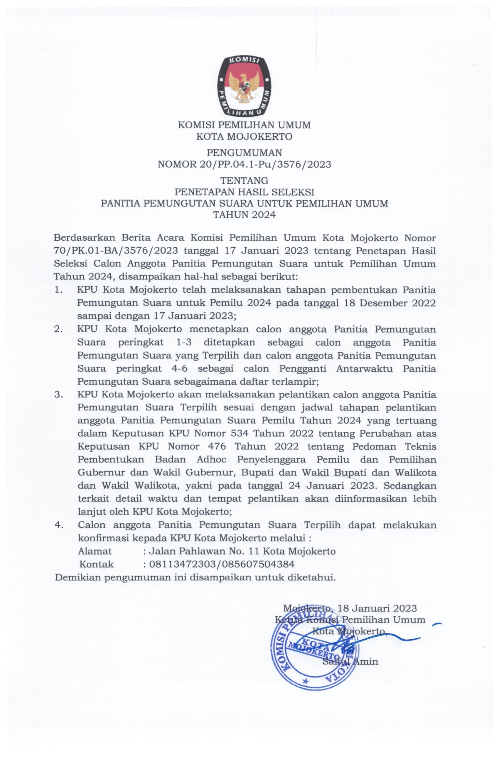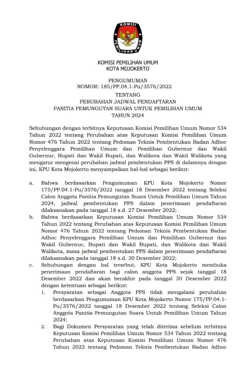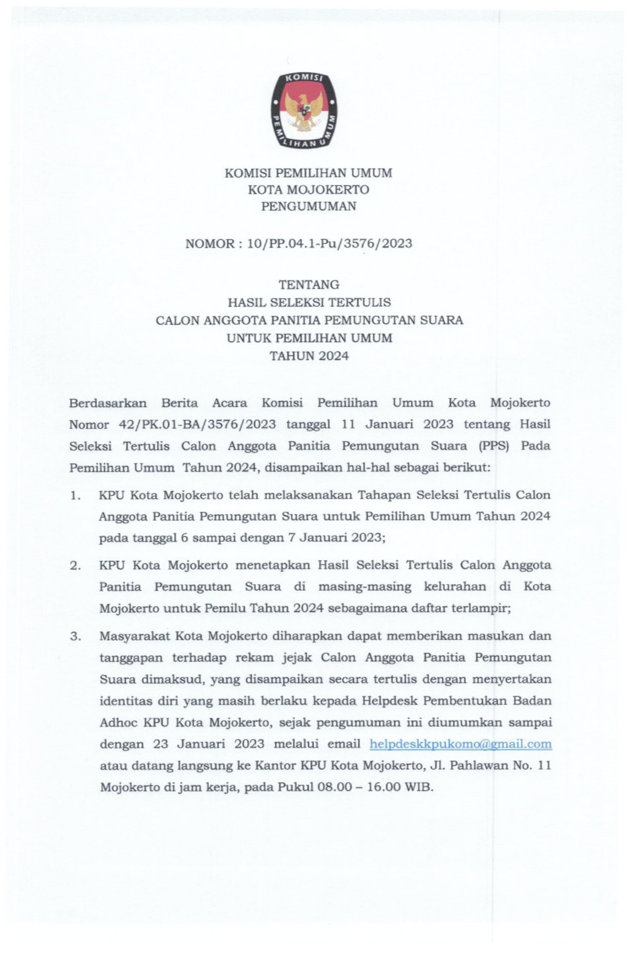 KPU Kota Mojokerto telah selesai melaksanakan Tahapan Wawancara Calon Anggota Panitia Pemungutan Suara (PPS) Pemilu Tahun 2024 pada tanggal 15 s/d 16 Januari 2023. Berikut ini adalah Pengumuman Penetapan Hasil Seleksi Panitia Pemungutan Suara (PPS) Pemilu 2024 Kota Mojokerto, di mana KPU Kota Mojokerto menetapkan peringkat 1 - 3 sebagai PPS Terpilih, dan peringkat 4 - 6 sebagai Pengganti Antarwaktu (PAW) PPS Pemilu 2024.(18/1/2023)