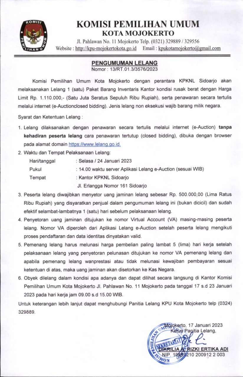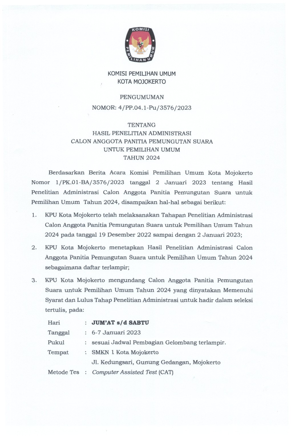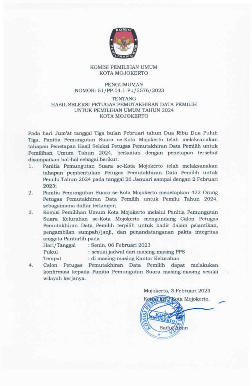 KPU Kota Mojokerto telah selesai melaksanakan Tahapan Wawancara Calon Anggota Panitia Pemungutan Suara (PPS) Pemilu Tahun 2024 pada tanggal 15 s/d 16 Januari 2023. Berikut ini adalah Pengumuman Penetapan Hasil Seleksi Panitia Pemungutan Suara (PPS) Pemilu 2024 Kota Mojokerto, di mana KPU Kota Mojokerto menetapkan peringkat 1 - 3 sebagai PPS Terpilih, dan peringkat 4 - 6 sebagai Pengganti Antarwaktu (PAW) PPS Pemilu 2024.(18/1/2023)