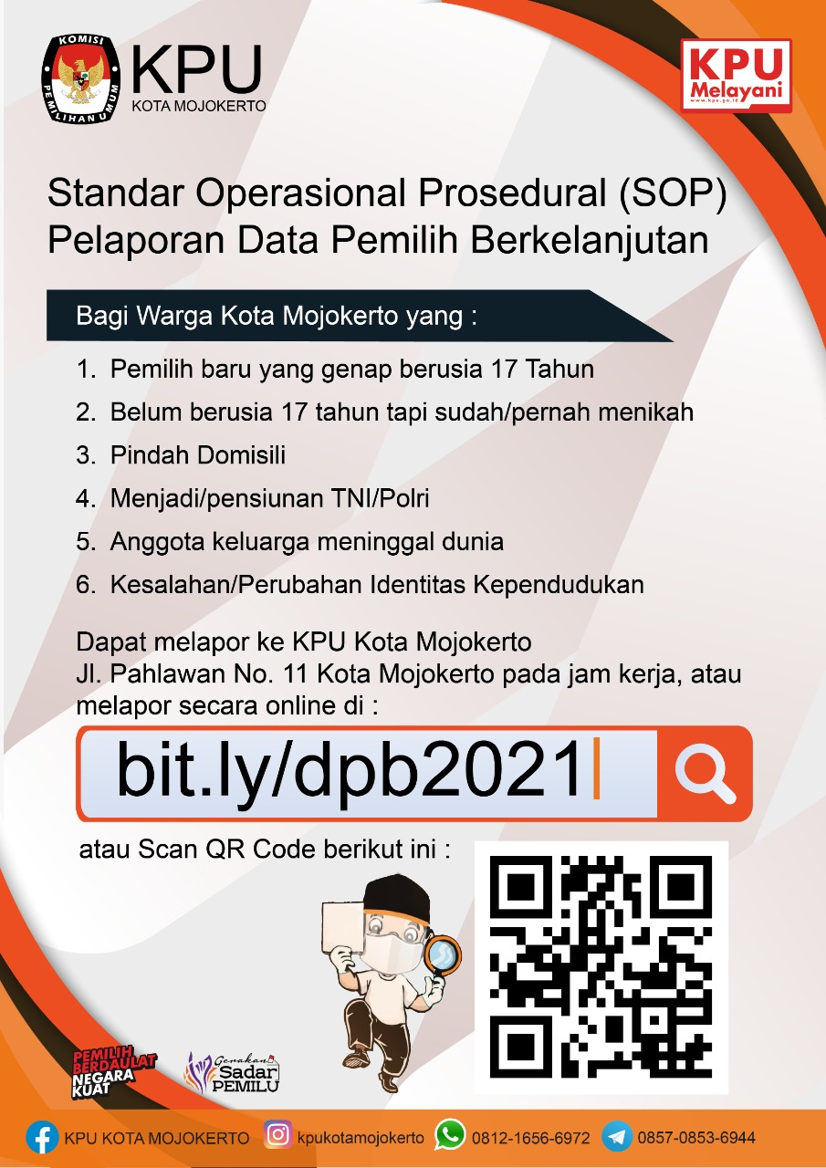 SOP Pendataan Pemilih Berkelanjutan Tahun 2021 Rabu, 01 September 2021 00:00 1316 KPU Kota Mojokerto melakukan pemutakhiran data pemilih tahun 2021, dan mempersilahkan pemilih yang belum terdata untuk menyampaikan data sebagai pemilih ke KPU Kota Mojokerto melalui prosedur sebagaimana terlampir. Baca Selengkapnya