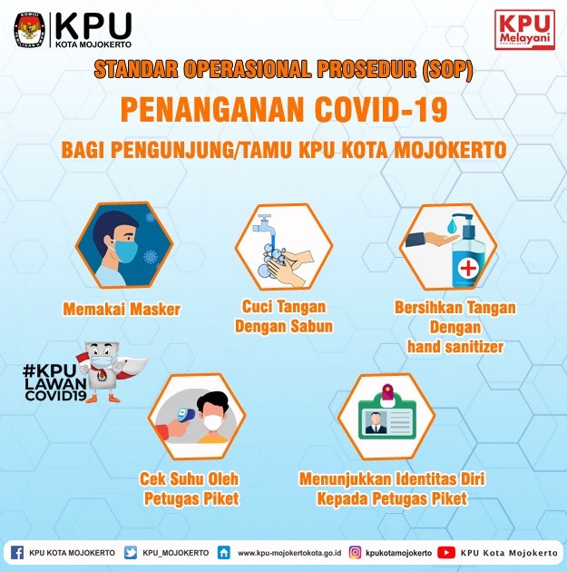 SOP KUNJUNGAN KE KPU KOTA MOJOKERTO DALAM MASA PANEDMI COVID-19 Rabu, 01 September 2021 00:00 1155 Selama masa Pandemi Covid-19 KPU Kota Mojokerto menerapkan protokol kesehatan dan SOP penanganan Covid-19 bagi tamu yang berkunjung Baca Selengkapnya