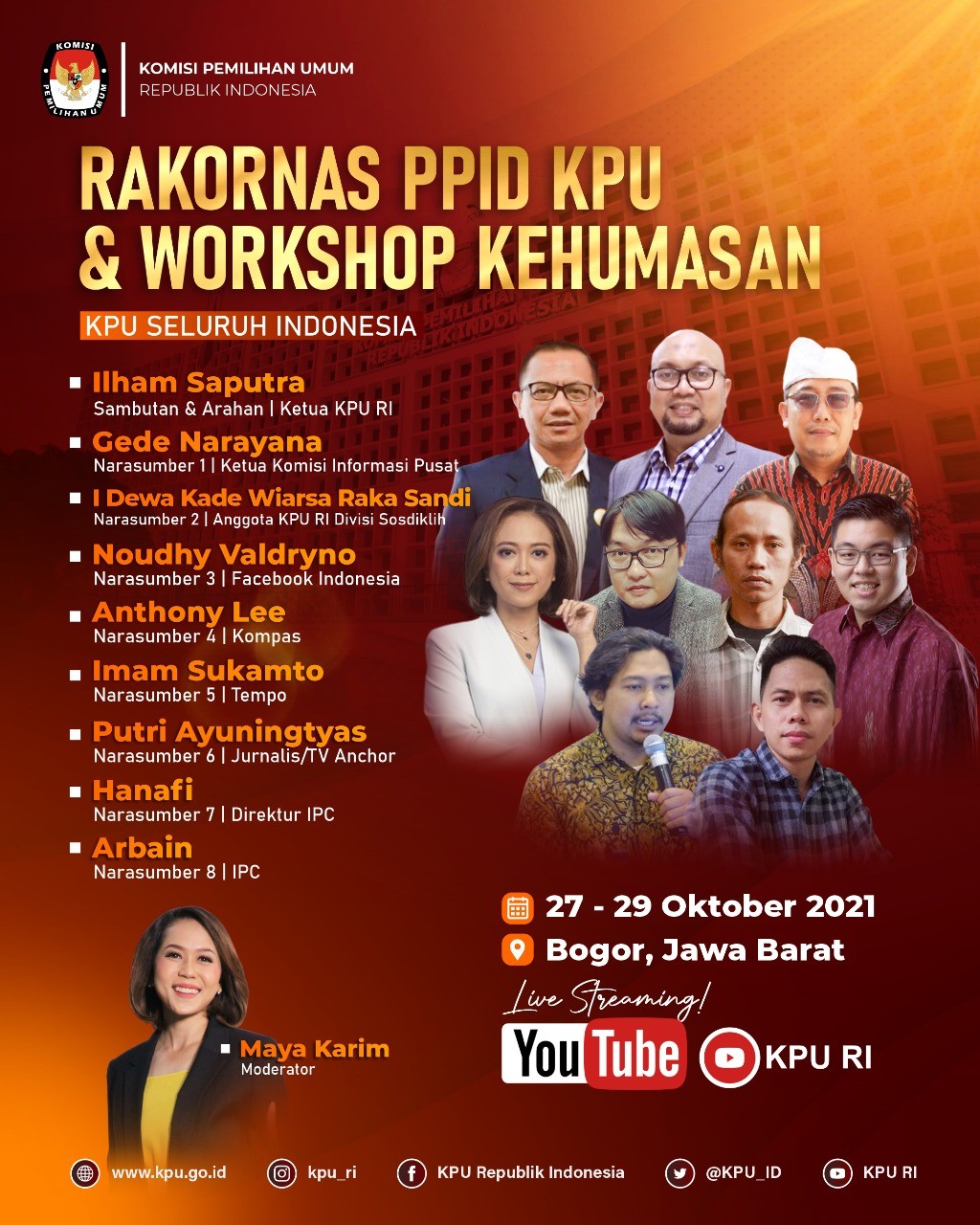 RAKORNAS PPID DAN WORKSHOP KEHUMASAN Rabu, 27 Oktober 2021 00:00 1152 TemanPemilih, jangan lupa ikuti Rakornas PPID KPU dan Workshop Kehumasan ini ya...langsung dari kanal youtube KPU RI Baca Selengkapnya