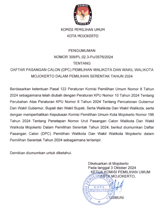 DAFTAR PASANGAN CALON PEMILIHAN WALIKOTA DAN WAKIL WALIKOTA MOJOKERTO TAHUN 2024 Sabtu, 05 Oktober 2024 07:00 137 Berikut disampaikan Daftar Pasangan Calon Pemilihan Walikota dan Wakil Walikota Mojokerto Tahun 2024. Unduh disini Baca Selengkapnya