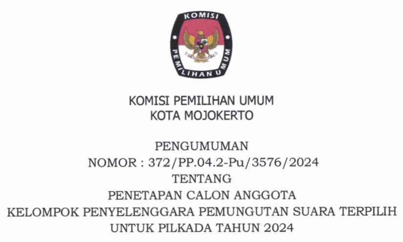 Pengumuman Penetapan Calon Anggota Kelompok Penyelenggara Pemungutan Suara Terpilih untuk Pilkada Tahun 2024 Kamis, 07 November 2024 21:54 96 Berikut disampaikan Pengumuman Penetapan Calon Anggota Kelompok Penyelenggara Pemungutan Suara Terpilih untuk Pilkada Tahun 2024. Unduh/lihat disini Baca Selengkapnya