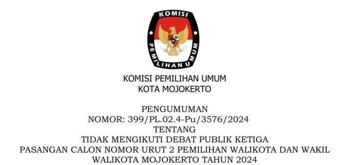 Pengumuman Tidak Mengikuti Debat Publik Ketiga Pasangan Calon Nomor Urut 2 Pemilihan Walikota dan Wakil Walikota Mojokerto Tahun 2024 Selasa, 19 November 2024 13:00 1248 Pengumuman selengkapnya dapat dilihat dan diunduh melalui tautan ini Baca Selengkapnya
