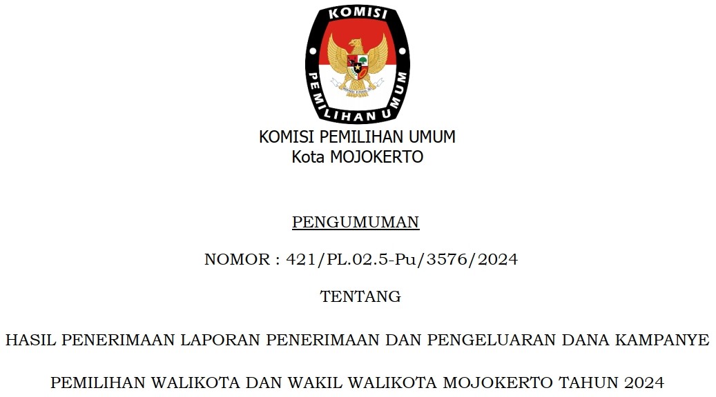 Pengumuman LPPDK Pasangan Calon Walikota dan Wakil Walikota Mojokerto Tahun 2024 Minggu, 24 November 2024 23:59 1199 Berikut disampaikan Pengumuman LPPDK Calon Walikota dan Wakil Walikota Mojokerto Tahun 2024. Unduh/lihat disini Baca Selengkapnya