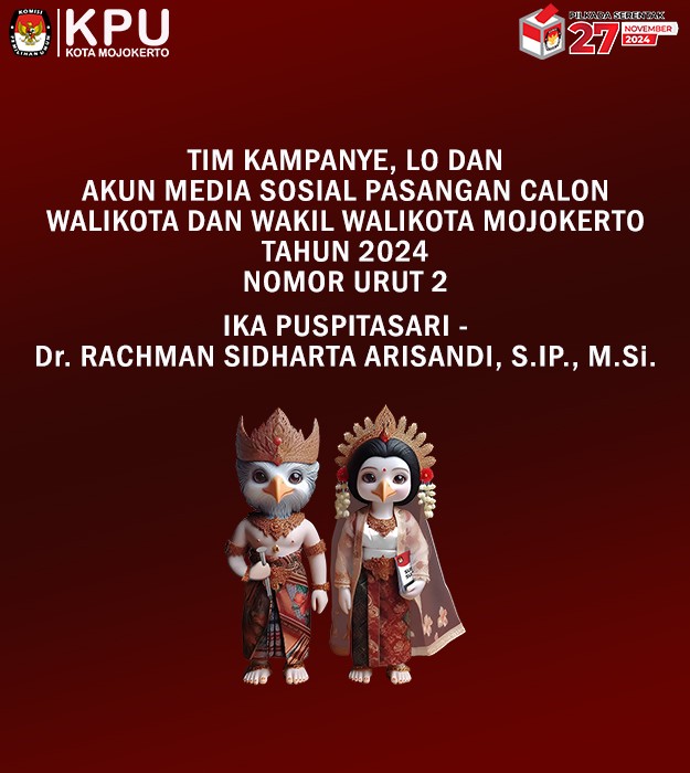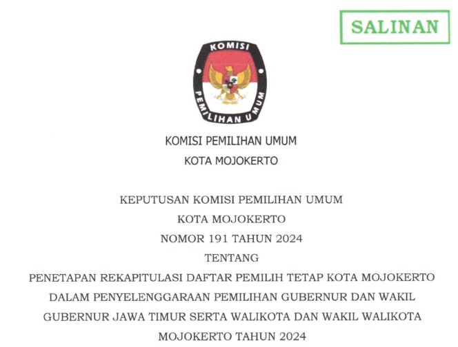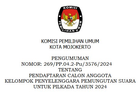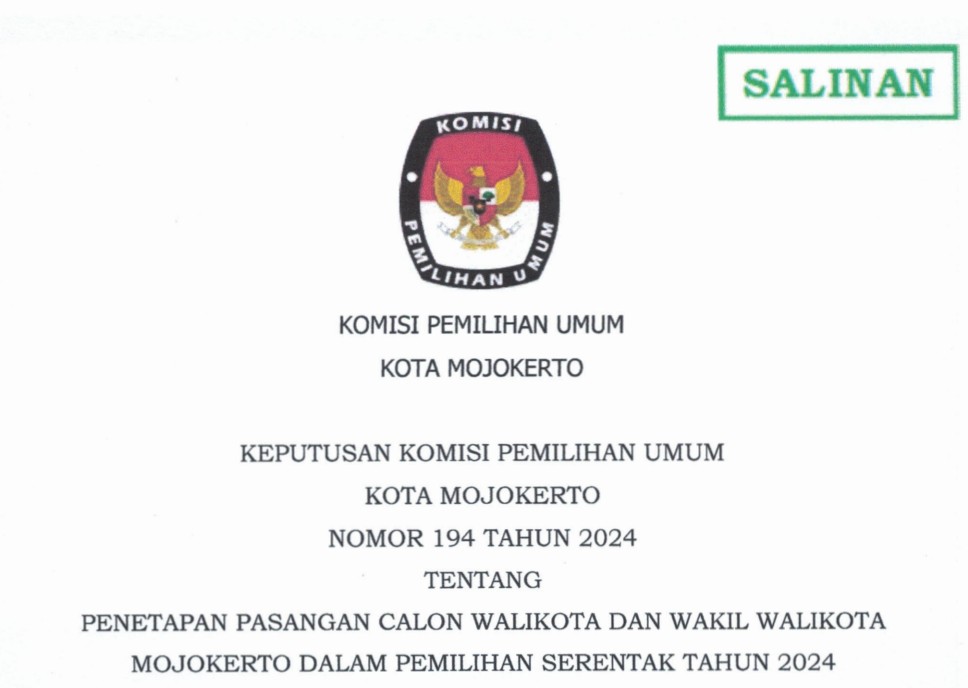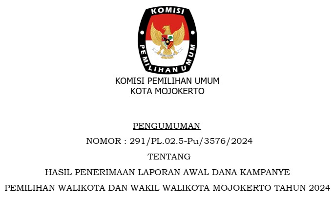 Mojokerto, kota-mojokerto.kpu.go.id - Berdasarkan Keputusan Komisi Pemilihan Umum Nomor 1364 Tahun 2024 tentang Pedoman Teknis Pelaporan Dana Kampanye Peserta Pemilihan Gubernur dan Wakil Gubernur, Bupati dan Wakil Bupati, serta Walikota dan Wakil Walikota, maka diumumkan Pengumuman Nomor 291/PL.02.5-Pu/3576/2024 tentang Hasil Penerimaan Laporan Awal Dana Kampanye Pemilihan Walikota Dan Wakil Walikota Mojokerto Tahun 2024.