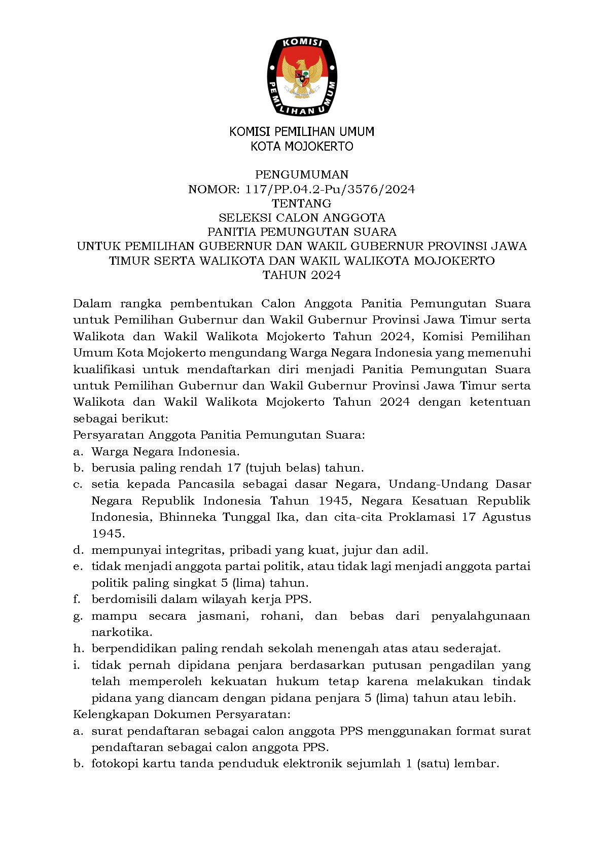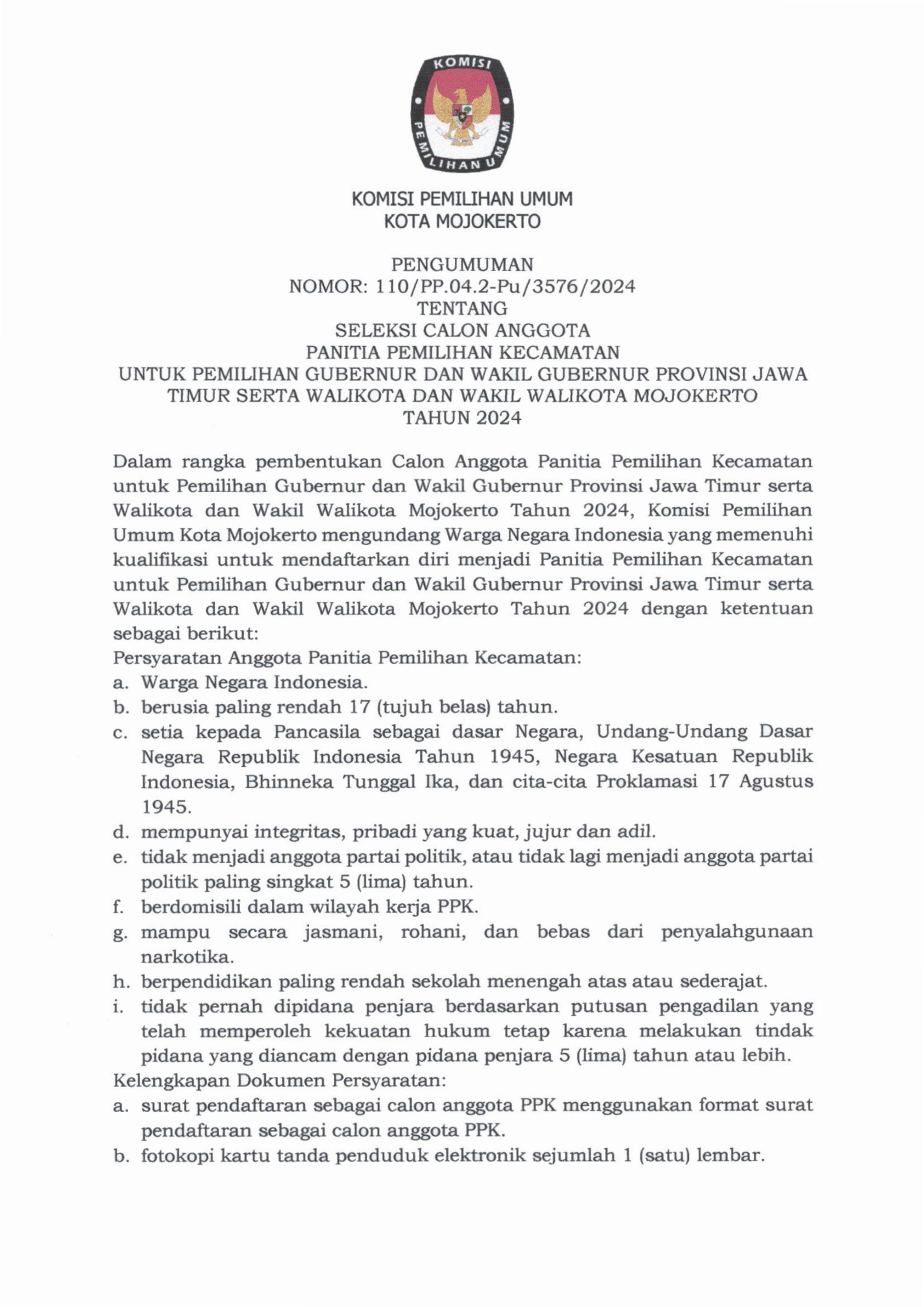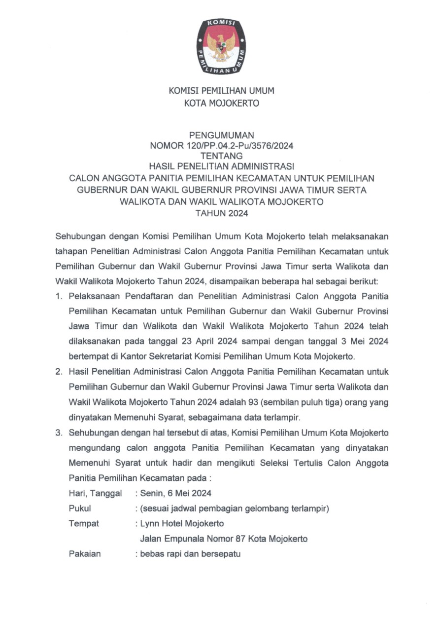 Berikut disampaikan Pengumuman Tentang Pendaftaran Bakal Calon Anggota KPU Kabupaten/Kota pada 36 Kabupaten/Kota di Jawa Timur Periode 2024-2029
